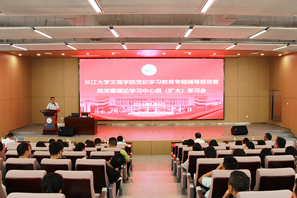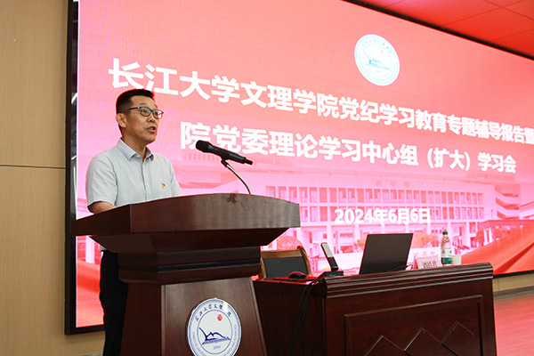 本网讯 6月6日下午,williamhill官网举办党纪学习教育专题辅导报告暨党委理论学习中心组(扩大)学习会,邀请长江大学党委常委、纪委书记刘靖君作专题辅导报告。报告会由williamhill官网党委书记颜建洲主持,williamhill官网领导班子全体成员、全体中层干部、机关职能部门全体工作人员、教学单位教师党员代表、基层党组织委员参加。