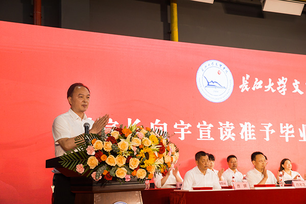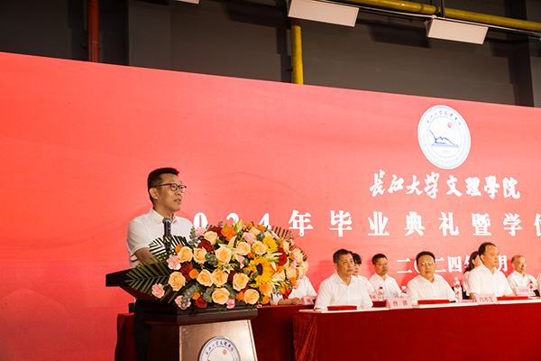 院长李兴祥代表学校向全体2024届毕业生表示最热烈的祝贺,以《一路向前》为题发表了热情洋溢的讲话,送上了真挚美好的祝福。他回顾了难忘的战“疫”时光,赞扬了同学们在灾难面前阳光向上、勇往直前、奉献社会的精神品质;他为同学们顺利完成学业而点赞。毕业率和学位授予率达到99%以上、213名同学入党、4名同学获得国家奖学金、22名同学被中国500强企业录用、68名同学考上硕士研究生、21名同学参加西部计划、255名同学奔赴教育一线,获评“中国大学生自强之星”的喻洁颖、满怀报国志奔赴军营的“女中豪杰”李夏晨、励志苦读考取中国科技大学研究生的宁普宇……李院长如数家珍,用数据和事实总结了一批优秀毕业生的成绩和事迹。