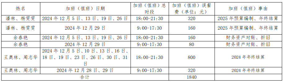 2024年12月计划财务处加班(值班)误餐情况统计表