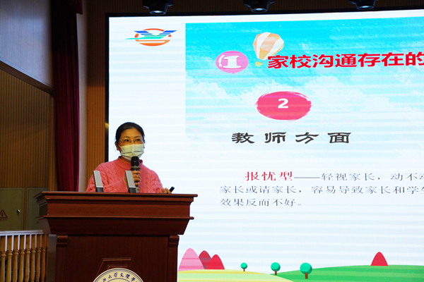焦老师以《家校沟通 共同成长》为题,从家校沟通中存在的问题、家校沟通的必要性、家校沟通的作用以及家校沟通的策略四个方面阐述了教师如何与家长进行有效沟通。她指出,学生是在学校、家庭以及社会的共同影响下成长的,家庭教育不是学校教育的简单重复,更不是学校教育的简单继续,而是与学校教育互为补充的一条重要途径。针对家校沟通的必要性和重要性,焦老师强调,家校沟通无效时,就会产生“5+2=0”,其中5是指周一到周五在校,2是指周六周日在家两天,0是指下周一到校知识量。只有当家校具有一致性时,5+2才会大于0,当家校朝一个目标共同努力形成合力时,5+2才会大于7。