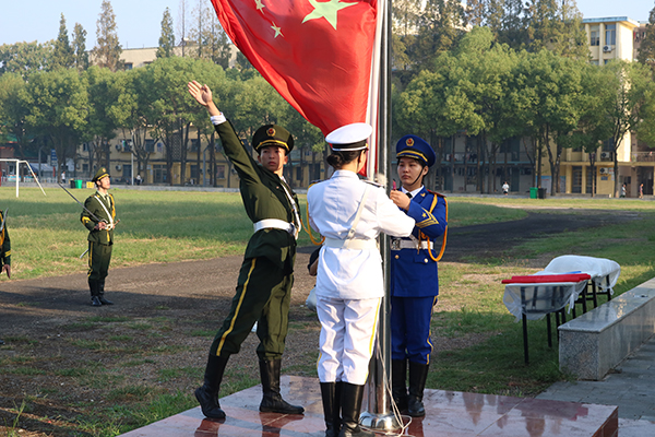 上午8时,伴随铿锵有力的脚步声,鲜艳的五星红旗在国庆仪仗队的护送下来到升旗台前。在庄严的国歌声中,五星红旗冉冉升起,飘扬在运动场的上空。全体师生行注目礼,共同祝福伟大的祖国繁荣昌盛,祝愿中华民族昂首走向复兴。