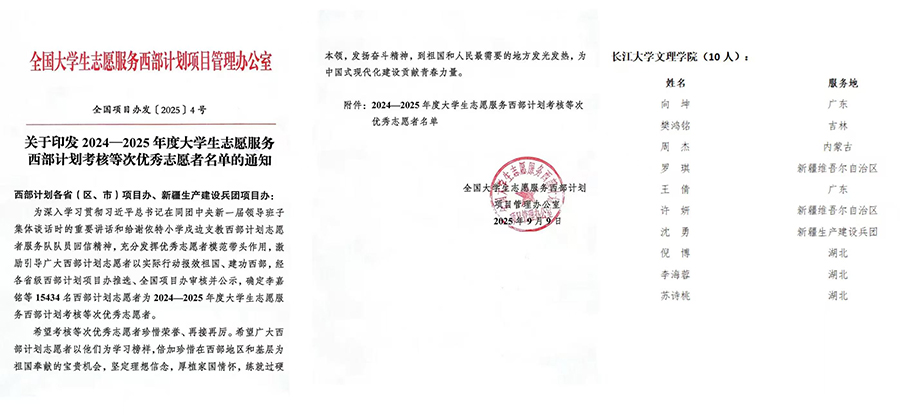 本网讯 近期,全国大学生志愿服务西部计划项目管理办公室印发《关于印发2024—2025年度大学生志愿服务西部计划考核等次优秀志愿者名单的通知》,williamhill官网向坤、樊鸿铭等10名西部计划志愿者在2024-2025年度考核中获评“优秀”等次。这份荣誉既是对志愿者们服务奉献精神的充分肯定,也是williamhill官网坚持以“两康一训”为育人导向,落实立德树人根本任务的生动体现。