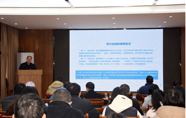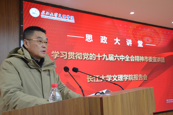 本网讯(记者 周芳)12月16日下午,我院举办学习党的十九届六中全会精神宣讲暨党委理论学习中心组学习(扩大)会。中共荆州市委宣讲团成员、长江大学马克思主义学院院长姜学勤教授作专题辅导报告。党委书记朱继平主持报告会,全体院领导、党委理论学习中心组成员、中层干部参会。