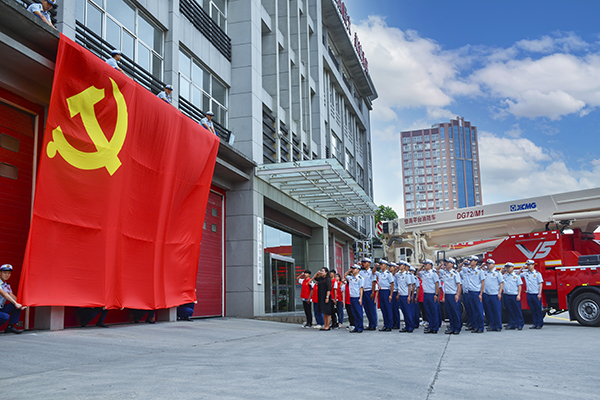 在消防救援大队门前,全体党员面对鲜红的党旗,高举右拳,重温入党誓词。在大队会议室,经济与法学系党总支副书记杨杉杉面向消防指战员和一批经法系大学生志愿者讲党课,加深大家对党史和新中国史的了解。讲课结束后,指战员和学生共同做手工,用大米拼成党徽、用粘土捏制党旗,在艺术体验中抒发爱党爱国热情。