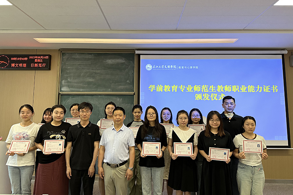本网讯(通讯员 马君莉)今天(6月16日)上午,学院在C-217教室举行学前教育专业师范生教师职业能力证书颁发仪式。副院长康建虎为此次通过教育部师范生免试认定的28名同学颁发证书,向在场学生表示祝贺,勉励同学们学以致用,为幼儿教育事业贡献一份力量。教育与心理学院党总支书记祝峰和相关负责人参加活动,仪式由教育与心理学院院长徐霄主持。(图片由教育与心理学院提供)