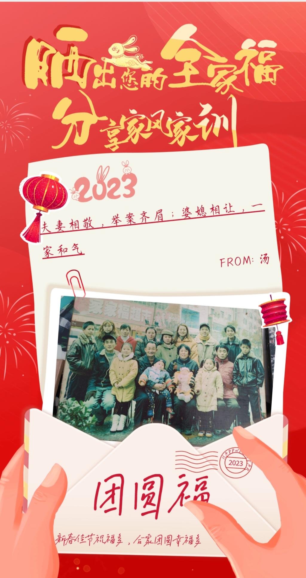 本网讯(通讯员 夏欣)春节是中国的传统节日,为大力弘扬中华优秀传统文化,营造传统佳节喜庆祥和的节日氛围,贯彻落实党的二十大报告关于“弘扬中华传统美德,加强家庭家教家风建设”的部署要求,williamhill官网管理学院团总支面向全学院广大学子家庭开展 “晒出您的全家福,分享家风家训”线上活动,管理学院学生会积极动员全学院的同学们,广泛参与本次活动,让好家风以生动鲜活的形式走进了万千家庭,增强了家庭的凝聚力和融合性,点燃浓浓亲情,传递社会正能量。