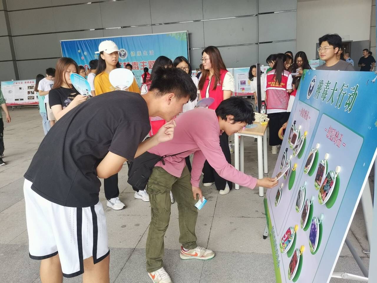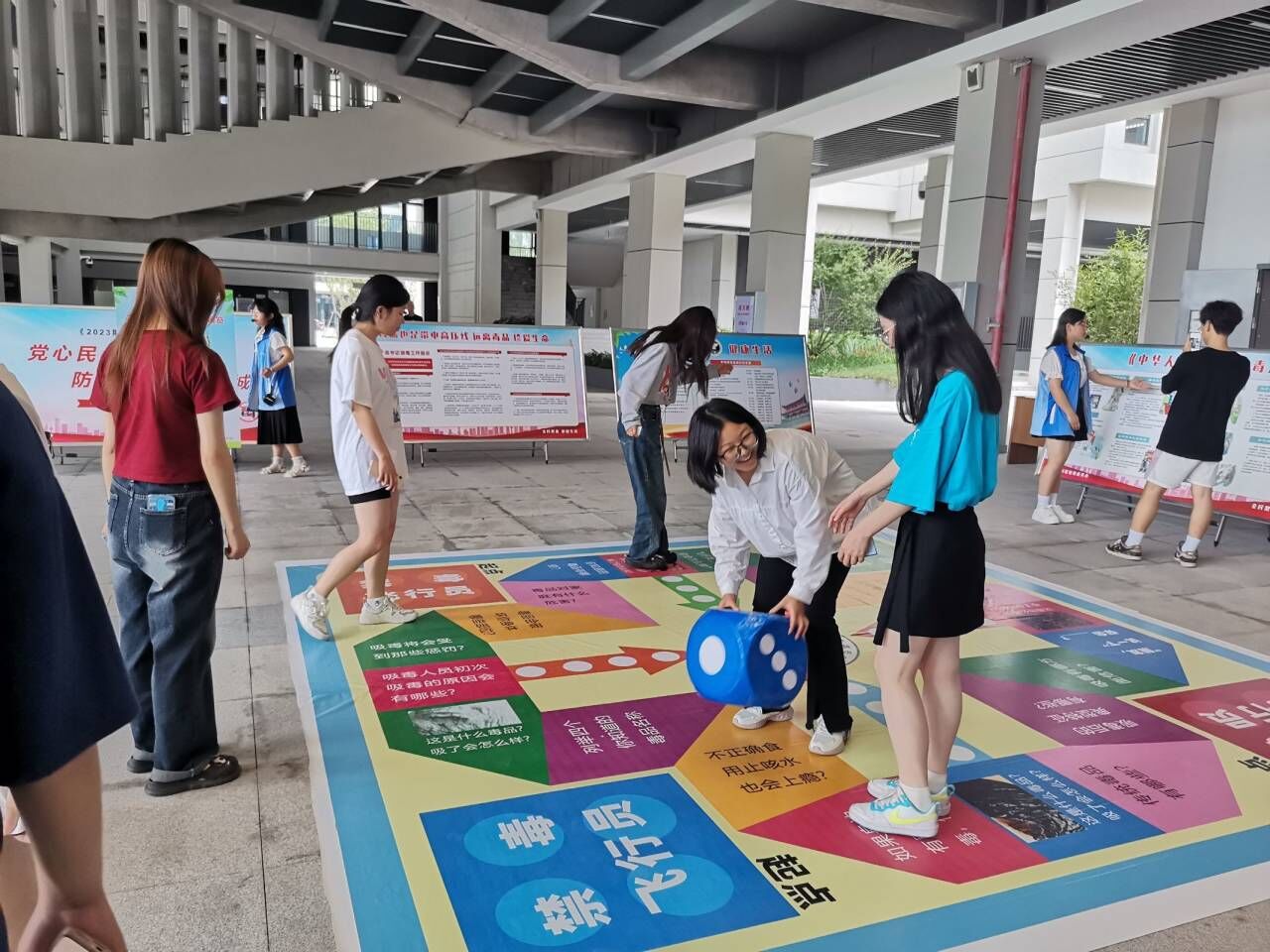 会场外设置了禁毒展览区和互动体验区,禁毒展览区陈列了仿真毒品、禁毒知识展板、禁毒文创品等,让学生在游览的过程中了解更多禁毒基础知识。同时,开展了禁毒展板签名留念、禁毒知识答题、“骰子飞行员”、“手脚并用”、“辨毒大行动”“禁毒科普讲解”等活动,营造了全方位、多角度、高频率、广覆盖的禁毒氛围,在全院掀起了禁毒宣传教育热潮。