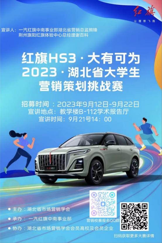 随着市场经济的不断发展,市场营销策划已成为企业成功的关键之一。本次大赛旨在为在校大学生提供一个“知行合一”的实践平台,培养大学生的营销策划和实践能力,提高同学们的综合素质。通过激发学生创意 、锻炼学生组织策划能力的同时提供一次难得的品牌营销的实战演练机会。本次大赛以“红旗HS3·大有可为”为名,以“红旗让理想飞扬,青春让梦想成真”为主题,以红旗汽车品牌相关车型为研究对象,进行营销策划。通过深入研究红旗品牌理念,挖掘红旗品牌的产品亮点,设计产品品牌营销推广方案,在整个比赛过程中,充分运用大学期间培养的专业知识和优秀的学习能力,以职业化的工作要求设置比赛内容,真正达到学以致用的目的,让大学生群体真正做到“大”有可“为”。