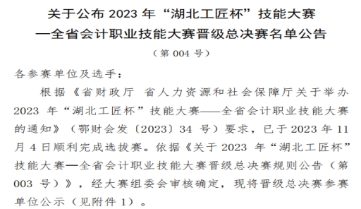 2023年11月4日,由湖北省财政厅、湖北省人力资源和社会保障厅共同主办、湖北省会计学会承办的“湖北工匠杯”技能大赛——湖北省会计职业技能大赛选拔赛在线上进行。