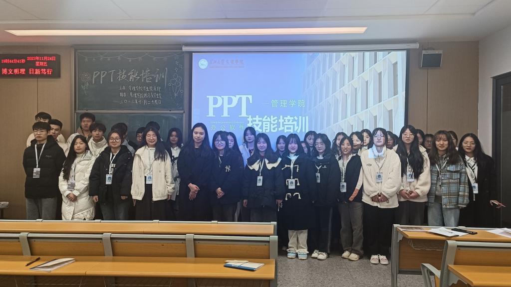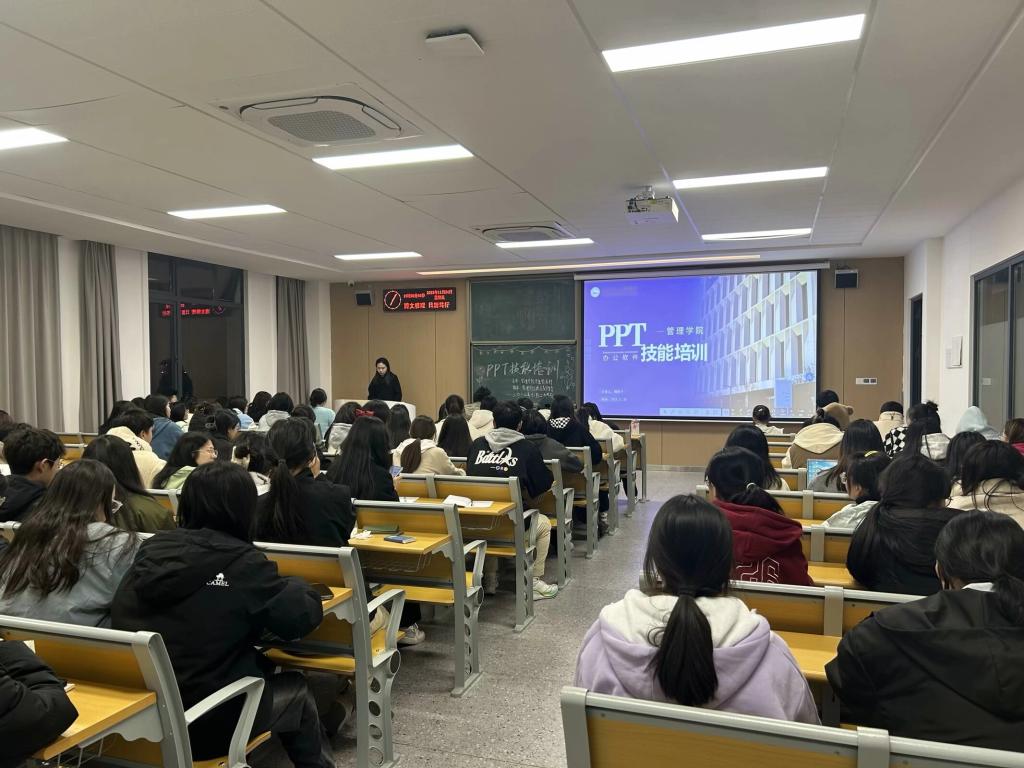 本网讯(通讯员周金金)为提高同学们PPT制作技能,增强学生干部的综合能力。2023年11月24日晚19:00点,管理学院于A-402开展了PPT技能培训会。本次培训会由管理学院团总支学生会主办,第十八届管理学院团总支学生会主席周铃子为本次培训会主讲人,学生会全体成员和部分班级的学生干部共80余人参加了此次培训。