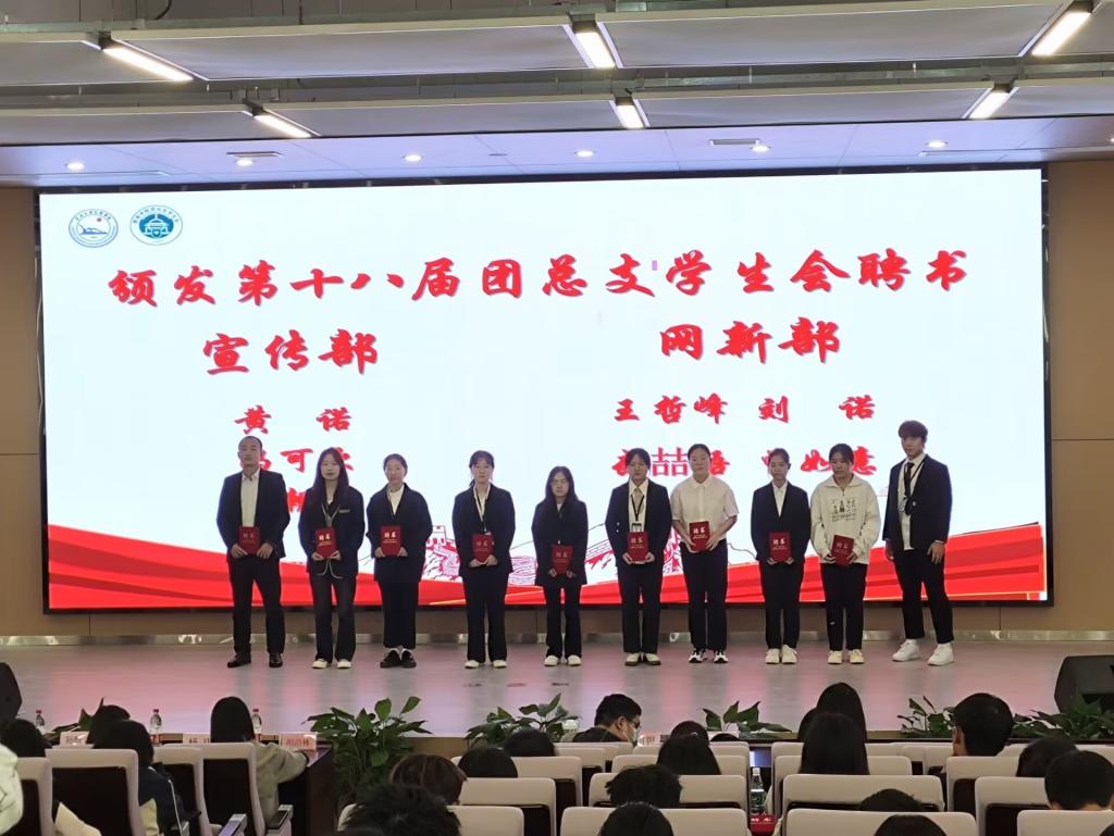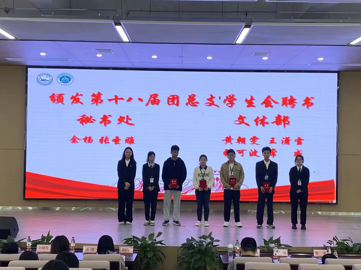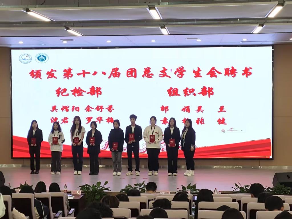 本次大会先由第十八届团总支学生会副书记刘洁发言。她向在场人员简要汇报了过去一年学生会的工作,并送给了大家一句话“长风破浪会有时,直挂云帆济沧海”。接着,颁发聘书,一纸聘书,承载着对成员们工作的肯定。接着,由十八届团总支学生会主席周铃子发言,她希望新一届学生会成员能携手合作,让学生会可以做的更好。