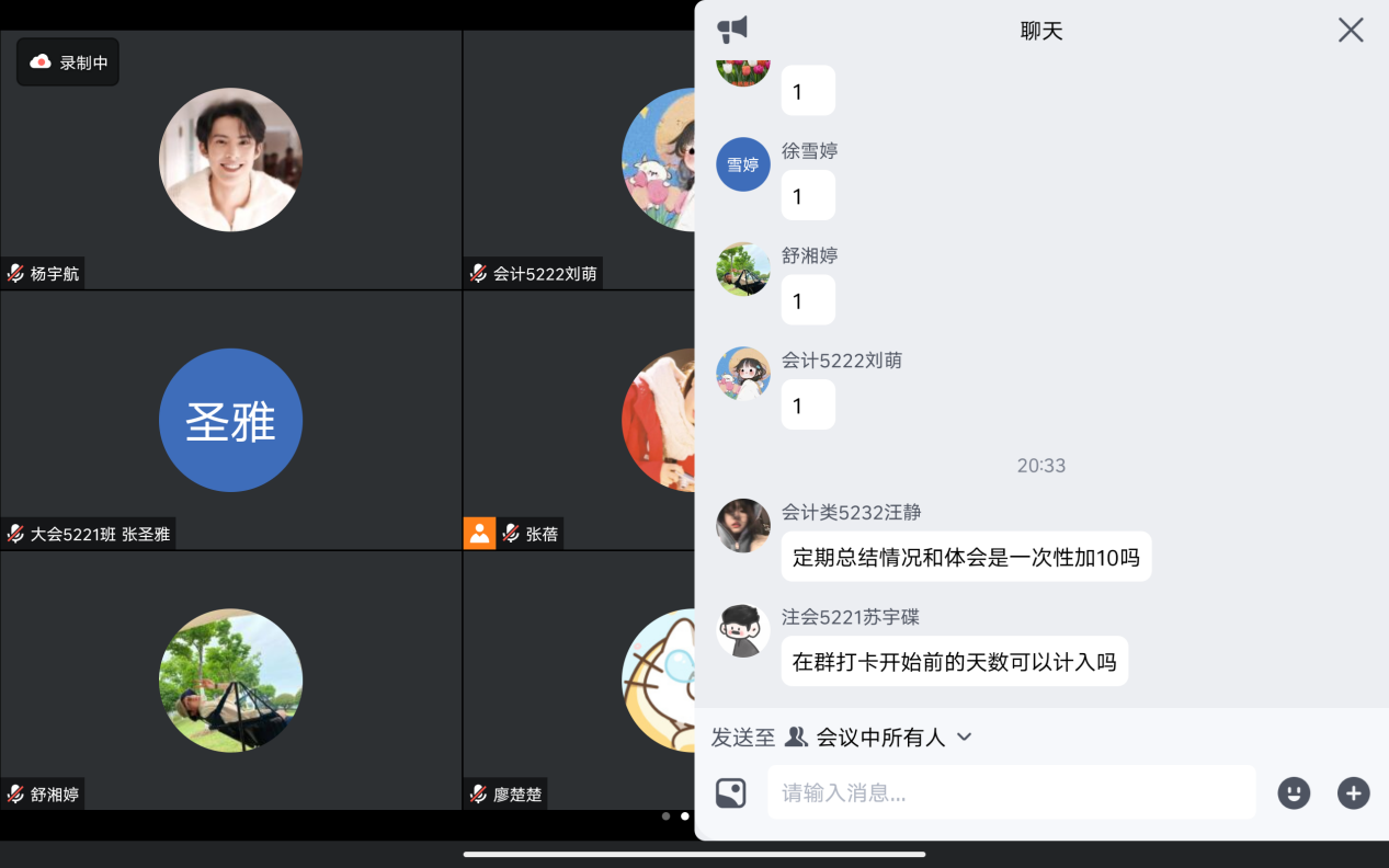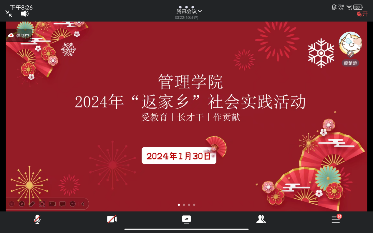 线上交流会开始,管理学院“返家乡”社会实践活动负责人廖楚楚按照实践原则,以“受教育、长才干、作贡献”为宗旨,对本次寒假社会实践考核评估要求进行详细介绍。负责人石佳针对考核评估要求给志愿者们提出了指导意见并给出相应建议,同时在提问环节对志愿者们提出的问题进行了一一解答。交流会中特邀请志愿者周光辉、苏宇碟和汪静分别向大家分享自己在实践活动中遇到的问题、如何解决问题以及做志愿以来的感悟和心得。周光辉表示在此次社会实践活动中,了解到每一项工作的辛苦和不易,真正学习到了社会经验,也锻炼了自己的处事能力和人际交往能力,真正做到了学以致用、积极创新。最后,管理学院党总支副书记杨琪对本次线上分享交流会进行了总结,对志愿者们的工作给予肯定,并嘱托志愿者们在完成好自己工作的同时注意身体。