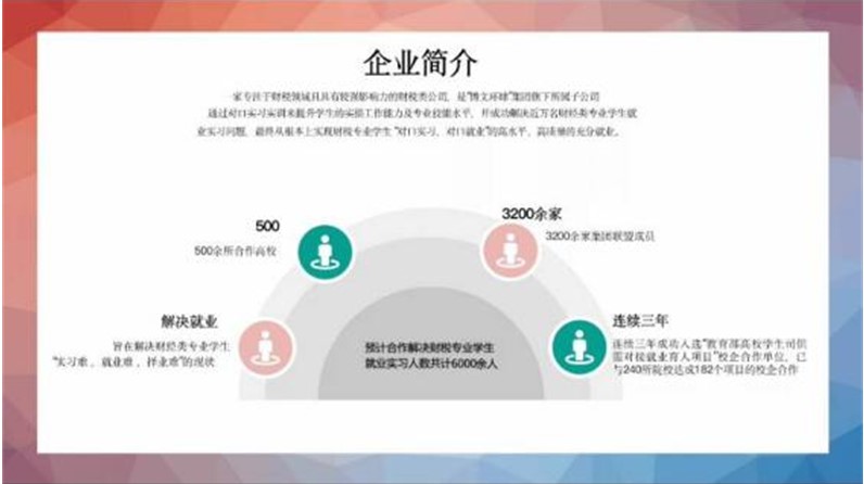 牛老师首先介绍了中企盈飞的企业背景和发展历程,作为“博文环球“集团旗下所属子公司,中企盈飞专注于财税领域,通过“对口实习,对口实训”来提升学生的实操工作能力及专业技能水平,并成功解决近万名财经类专业学生就业实习问题。并且拥有3200余家集团联盟成员和500余所合作高校。连续三年成功入选“教育部高校学生司供需对接就业育人项目”校企合作单位,已与240所院校达成182个项目的校企合作。