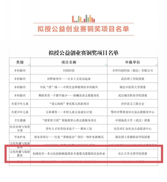 本网讯(通讯员 马卉)2024年9月,第七届湖北省青年志愿公益项目大赛落下帷幕,由杨琪、孙晗雪担任指导老师,管理学院人力资源管理专业学生马卉为队长,殷佳怡、钱映竹、梁换组成的学生队伍项目《如漆而至——多元化创新赋能国家非遗楚式漆器的活态传承》在公益项目创业赛组别中获得铜奖!