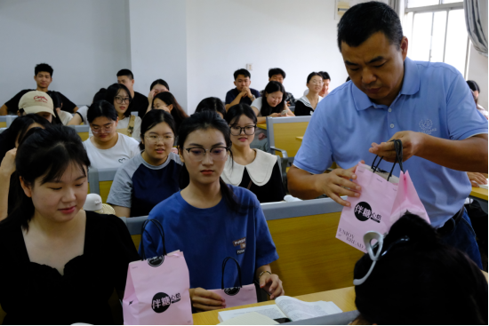 9月14日上午,南校区506教室充满了欢声笑语,管理学院院长姚毅、党总支书记胡沿林、新生班级班主任张勤、辅导员孙晗雪、杨柳等老师们在课间进入班级、宿舍等场所,为同学们发放月饼,让远离家乡的新生们感受到了家的温暖。收到月饼的同学们表示,虽然身在异乡,但学院的关怀让他们倍感温暖。