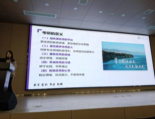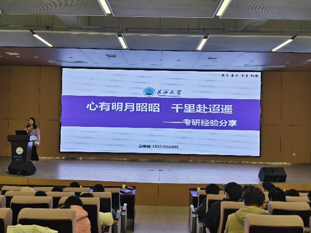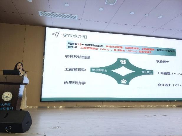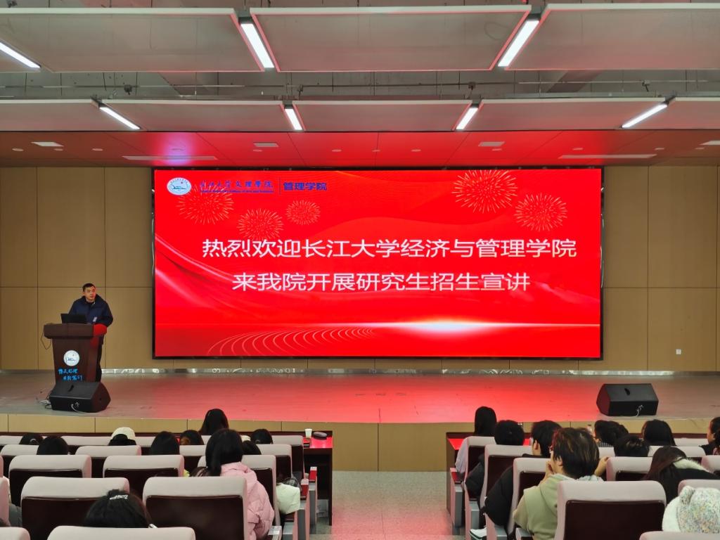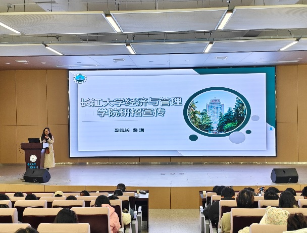 首先,长江大学经济与管理学院副院长裴潇老师上台进行研招宣讲,她向同学们详细介绍了长大经管学院3个硕士点的详细情况,着重介绍了考取长江大学的优势和难易程度,激发同学们的报考信心;紧接着向同学们展示校园校园环境、饮食、师资力量、奖助学金等吸引大家积极报考。