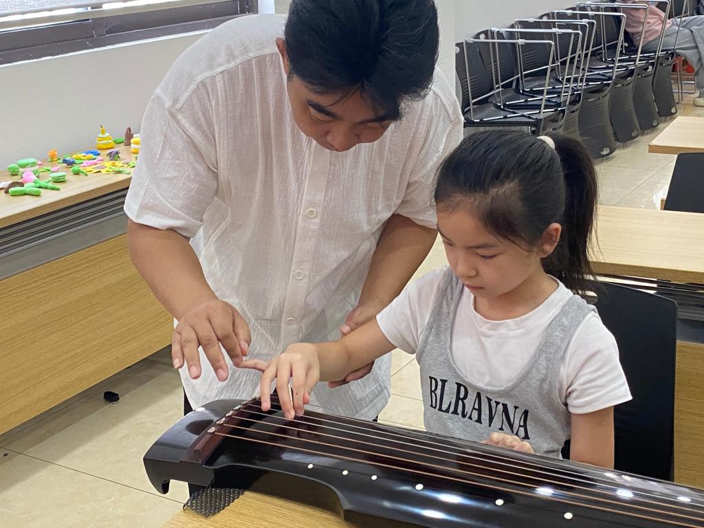 随着一声清越的挑弦声响起,课堂进入实践环节。余刚老师将古琴平放膝上,右手悬于弦上示范:“看这个‘勾’——”他食指轻屈,向掌心一带,琴弦发出嗡的低吟,似远山传来的悠长回声;随即指尖一转,轻快向外一挑,琴弦蹦出清亮的音,脆如檐角滴落的水珠。“勾要稳,挑要活,就像讲故事有轻有重。”老师的讲解生动形象,孩子们纷纷抬手模仿。