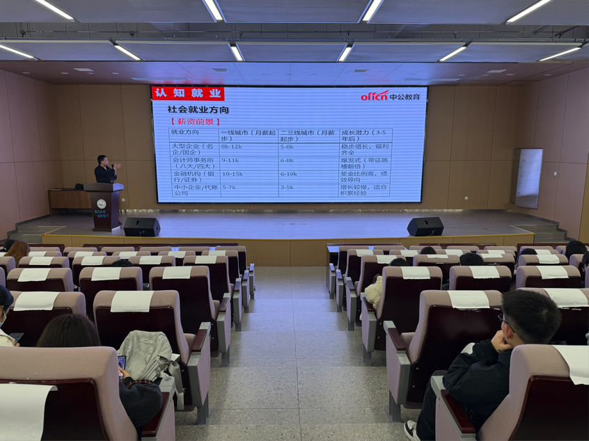 本网讯(通讯员 梁若暄)为帮助2023级本科生科学规划升学与就业路径,提升职业决策能力,3月24日晚,由职引未来辅导员工作室与中公教育荆州分校联合主办的“职业选择 科学决策——升学就业精准规划指导”讲座在主校区教学楼B-112报告厅成功举办。本次讲座面向2023级全体本科生,吸引众多学子到场聆听、交流学习。