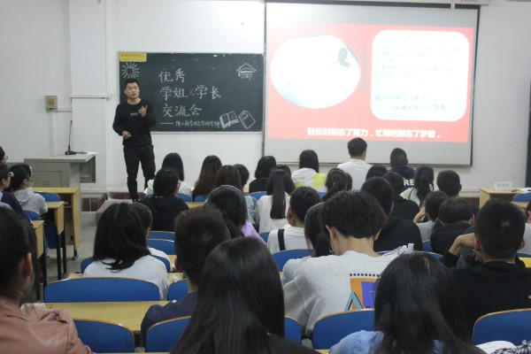 在会议开始之前,主持人用短短几分钟向大家介绍了王英洁、何庆和蒋卓三位优秀的学姐学长,虽然是几分钟时间但是足以让全场热血沸腾。在憧憬的目光下,王英洁学姐在学习方面对大家做了详细的指导,对大家之后所要参加的英语四六级考试以及计算机二级考试做了详细的说明,她还指出:“大学生活不是一味的学习,更要劳逸结合,参加各类活动,提升个人综合素质。”;而何庆学长主要是与大家分享了一些自己在实习期间的经历,并告诉大家如何应对自己在专业课上的困惑,他认为:“学历只是一个起步点,不应因为学历低而自暴自弃。”他用自己亲身经历积极的鼓励着大家;蒋卓学长作为最后一名发言人,不仅嘱咐了在座的学弟学妹们在大学期间该如何去学习,而且在分享了一些之后再工作面试时如何应对一些常见的问题。他说:“人生本就是冒险,无论得到多大荣誉都不该止步于前。”蒋卓学长的讲话深深感动着在场的学弟学妹。在三位优秀的学姐、学长的发言之后,场下的气氛依旧活跃,掌声不断。