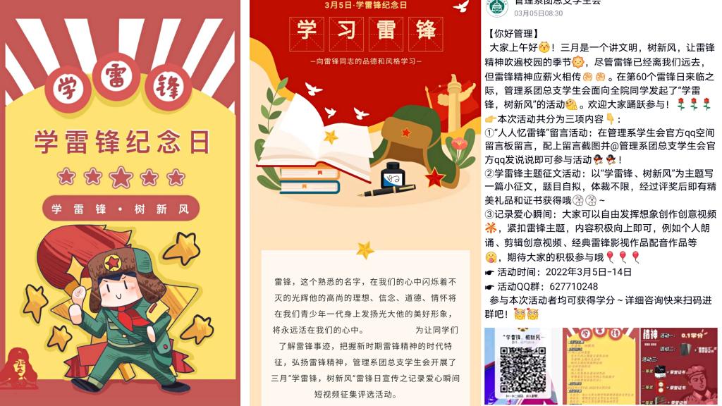 为让学生了解雷锋纪念日的由来,知晓雷锋的生平、名言、光荣事迹,继承和发扬雷锋诚实守信、热心公益、助人为乐、无私奉献的精神,以雷锋为榜样,争做新时代志愿者,倡导校园文明新风,大力弘扬雷锋精神,更好地引导学生了解雷锋事迹,管理系团总支学生会进行了“人人忆雷锋”留言活动、学雷锋主题征文活动以及记录爱心瞬间活动。同学们积极热情参与,良好的宣传了雷锋精神,本次活动不仅加深了同学们的学雷锋意识,歌颂了雷锋全心全意为人民服务的品质,让大家对“雷锋精神”有了新一层的认识,而且为校园文化增添了一道亮丽的风景线。