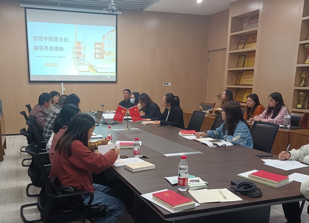 本网讯:(通讯员:杨 琪)为强化学生教育管理工作实效,加强学生工作队伍能力建设,我院于10月12日在图书馆5楼会议室召开辅导员班主任工作培训会议。管理学院院长陈元芳、党总支书记胡沿林、党总支副书记杨琪、全体辅导员及班主任参加,会议由胡沿林主持。