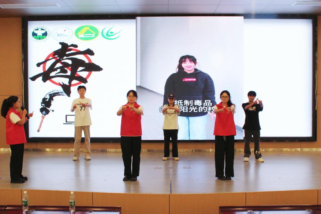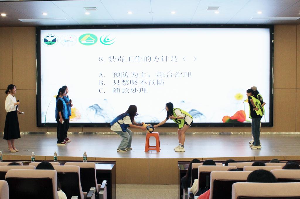 讲座后,活动进入高潮迭起的互动环节。报告厅内,禁毒手势舞用肢体语言传递拒毒决心;绕口令挑战让禁毒宣言朗朗上口;问答连连看及知识竞赛激烈比拼禁毒知识学习情况;禁毒志愿者带来的原创朗诵《青春不“毒”行—禁毒卫士的时代宣言》,以铿锵之声发出时代强音。