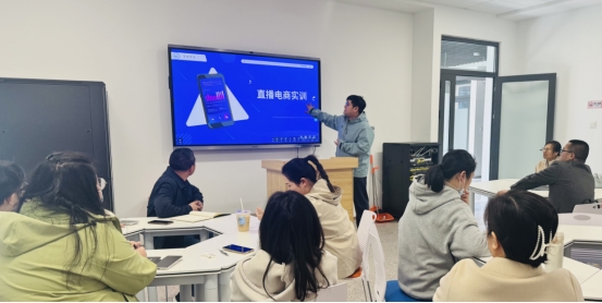 随后,在韩子英老师的指导下,两位学生现场进行了直播演示,不仅展示了学生们在直播实训中的学习成果,也为在场的教师们提供了宝贵的教学参考。戈老师和韩老师并给在座的老师进行了直播平台的演示,详细地演示了直播平台各个环节的操作,活动现场气氛热烈。