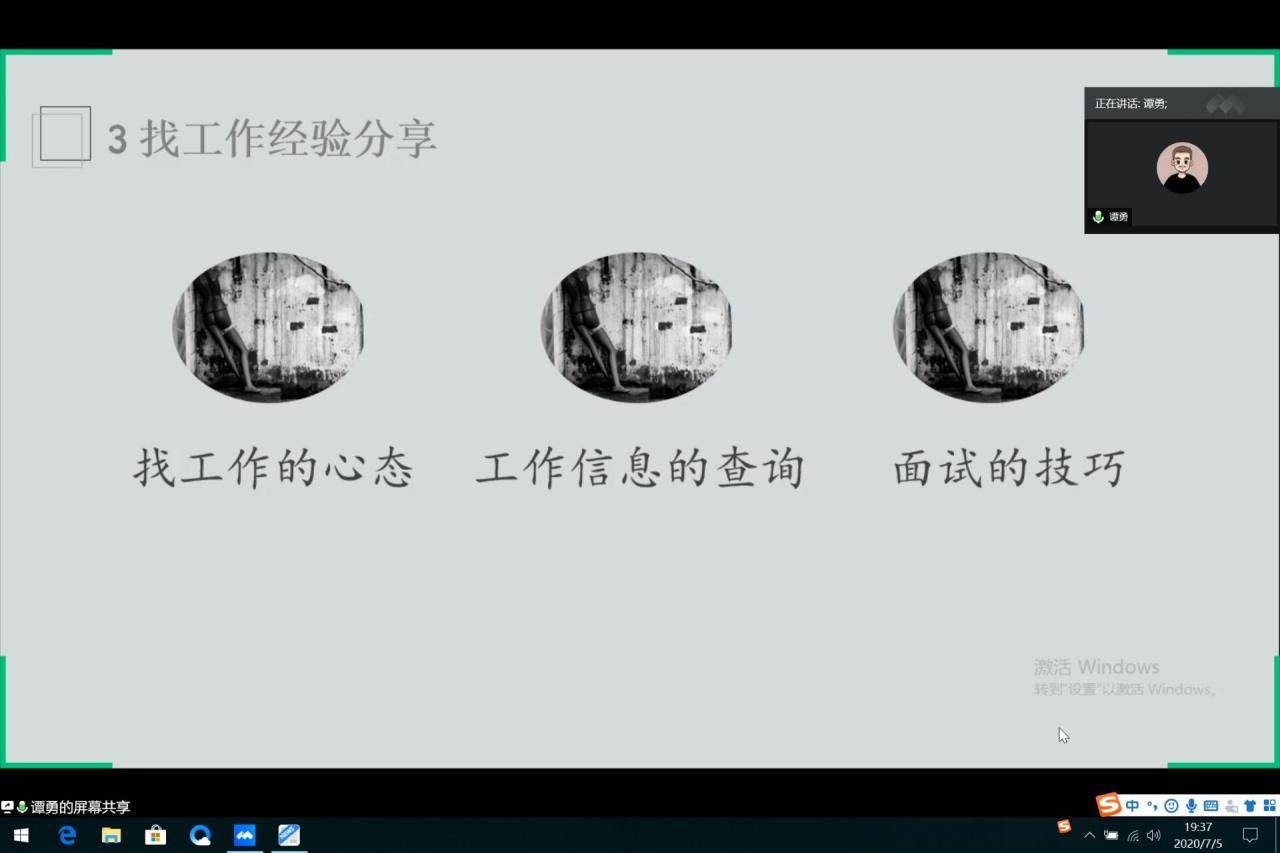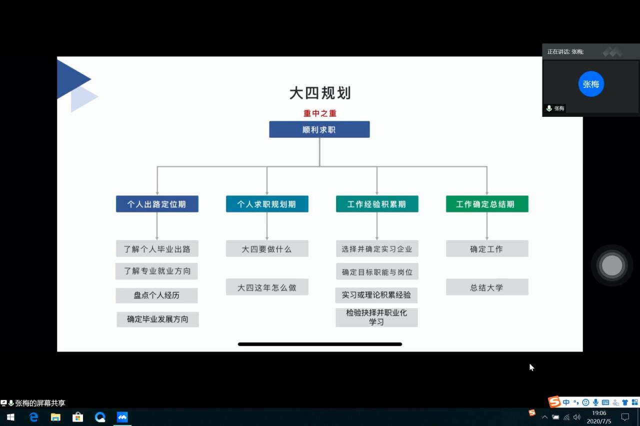 本网讯(通讯员 张宇琼)如何找到一份满意的工作?7月5日晚,在腾讯会议平台上,我系2020届优秀毕业生张梅、谭勇为即将升入大四的学生们分享了就业经验和面试技巧。
