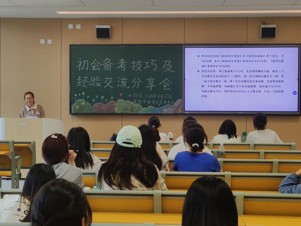 本网讯(通讯员 陈佩琳)为帮助我院会计专业同学们提前了解并提早规划专业证书的考试以及动员同学们的学习积极性,秉持着“我为同学办实事”的宗旨,管理学院于4月27日下午16:00在A-408开展了初会备考技巧及经验分享会。本次分享会邀请到取得初级会计师证书的优秀学生张双和李亚蓉来与同学们进行经验交流。