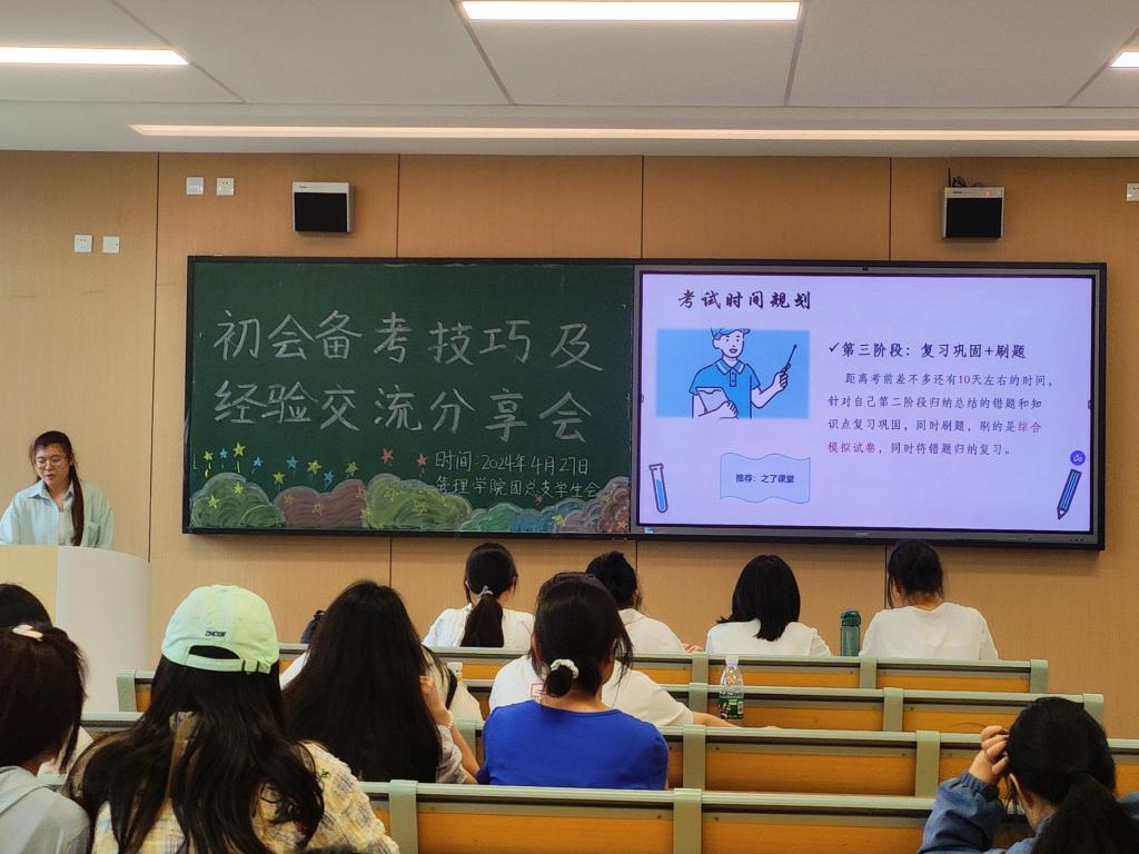 分享会开始,张双针对初会的考试科目以及考试内容为同学们作了详细介绍,并分享了自己当时在备考时遇到的问题和经验教训。她着重强调在备考的过程中一定要认真按计划来,不要把学习内容堆积在考试前夕。接着,李亚蓉向同学们详细列出了自己的三个阶段考试复习时间规划以及考试技巧,还仔细说明了在考试时的注意事项,让同学们不丢“冤枉分”。
