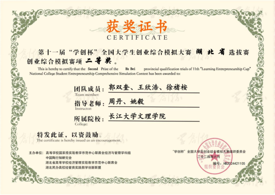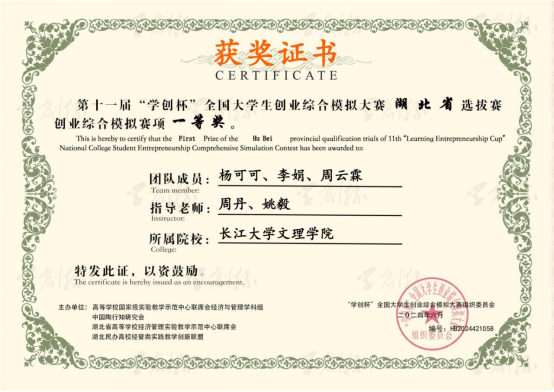 本网讯(通讯员 周丹)在近日结束的第十一届“学创杯”全国大学生创业综合模拟大赛湖北省选拔赛中,管理学院学子杨可可、李娟、周云霖组成的参赛团队获得创业综合模拟赛项一等奖,郭双奎、王欣浩、徐褚桉组成的参赛团队获得二等奖。
