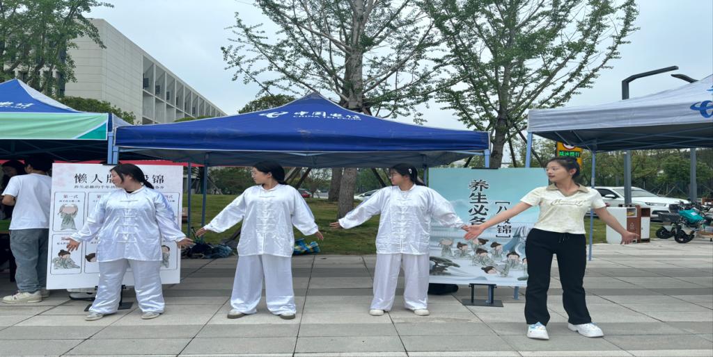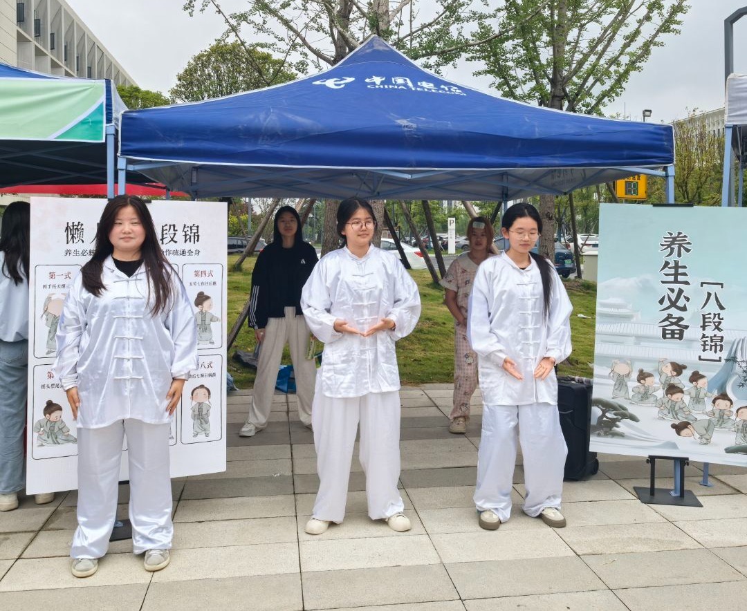 活动现场,精心设计的印章打卡机制串联起多个趣味体验区,学生们手持集章卡穿梭其中,兴致盎然。动静相宜的八段锦体验区人气十足。在工作人员的带领下,同学们凝神屏息,一招一式认真模仿——从舒展流畅的起势到沉稳优雅的收势,动作虽初学略显生涩,但那份专注与投入清晰可见。柔和的肢体伸展间,压力仿佛随之释放。“练完感觉身体放松了,心里也平静不少”,一位参与者边擦汗边笑着说,大家在强身健体之余,真切感受到了传统养生文化的魅力。