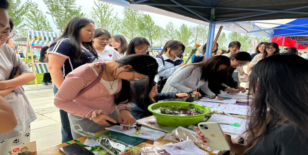 植物拓印体验区则弥漫着自然的气息与创造的乐趣。在专业指导下,同学们精心挑选形态各异的叶片花草,细心铺陈在棉布上,随后用小锤专注地敲打。清脆的敲击声中,植物的脉络、色彩被清晰地拓印下来,一幅幅独一无二的自然画作跃然布上。这不仅是动手实践,更是一次生动的自然美育与劳动教育融合课,学生们在创作中感受着自然的疗愈力量。