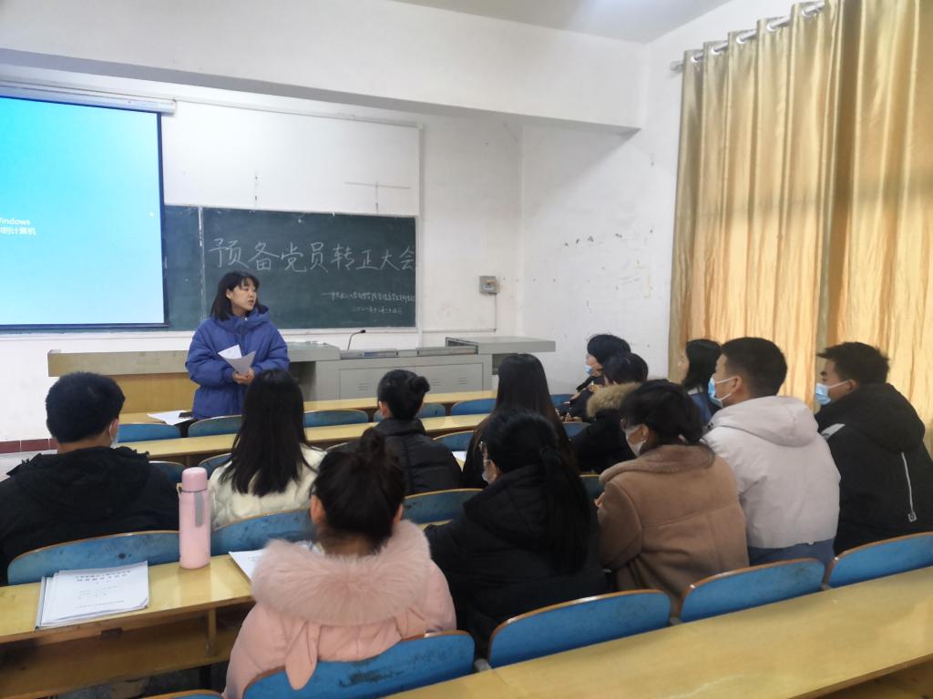 本网讯(通讯员 周夏盈) 2021年12月24日星期五中午12: 30, 我系学生党支部于一教407召开预备党员接收大会。讨论关于高光楠、严思微等4名同志转正为正式党员。会议由胡沿林同志主持,该支部在校其他党员同志同时参加会议,就此发表意见。