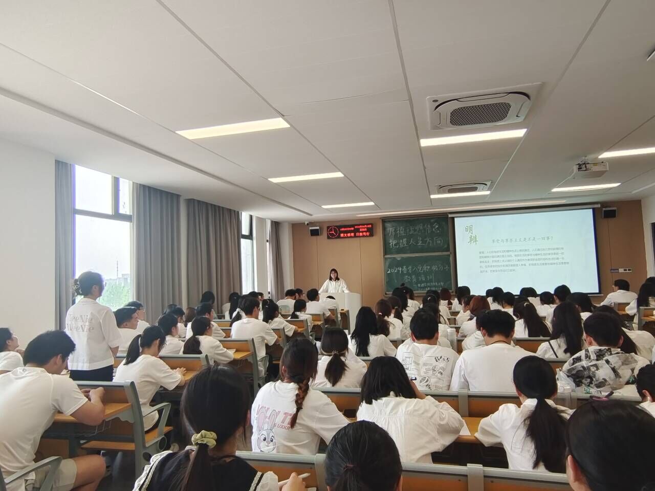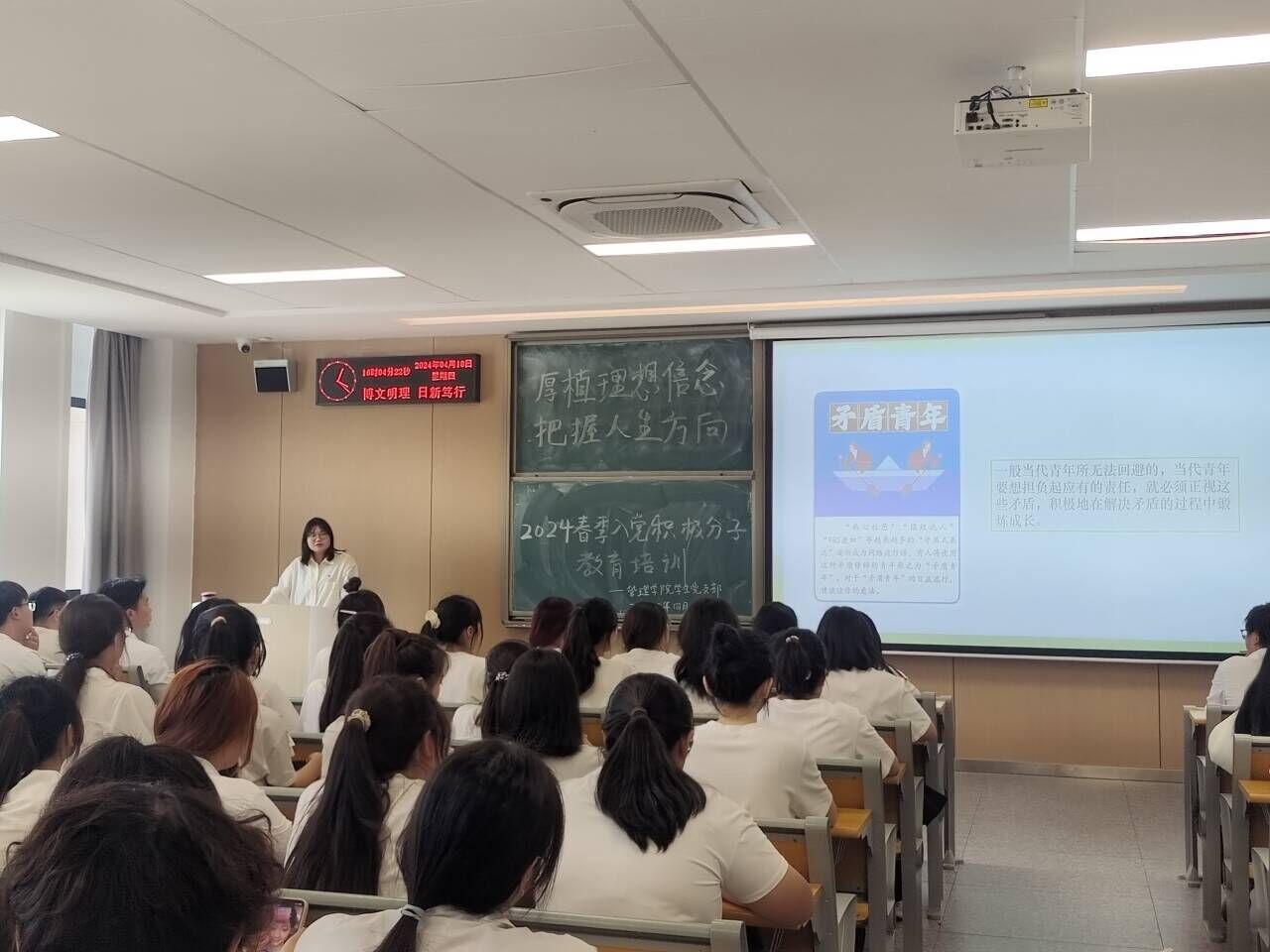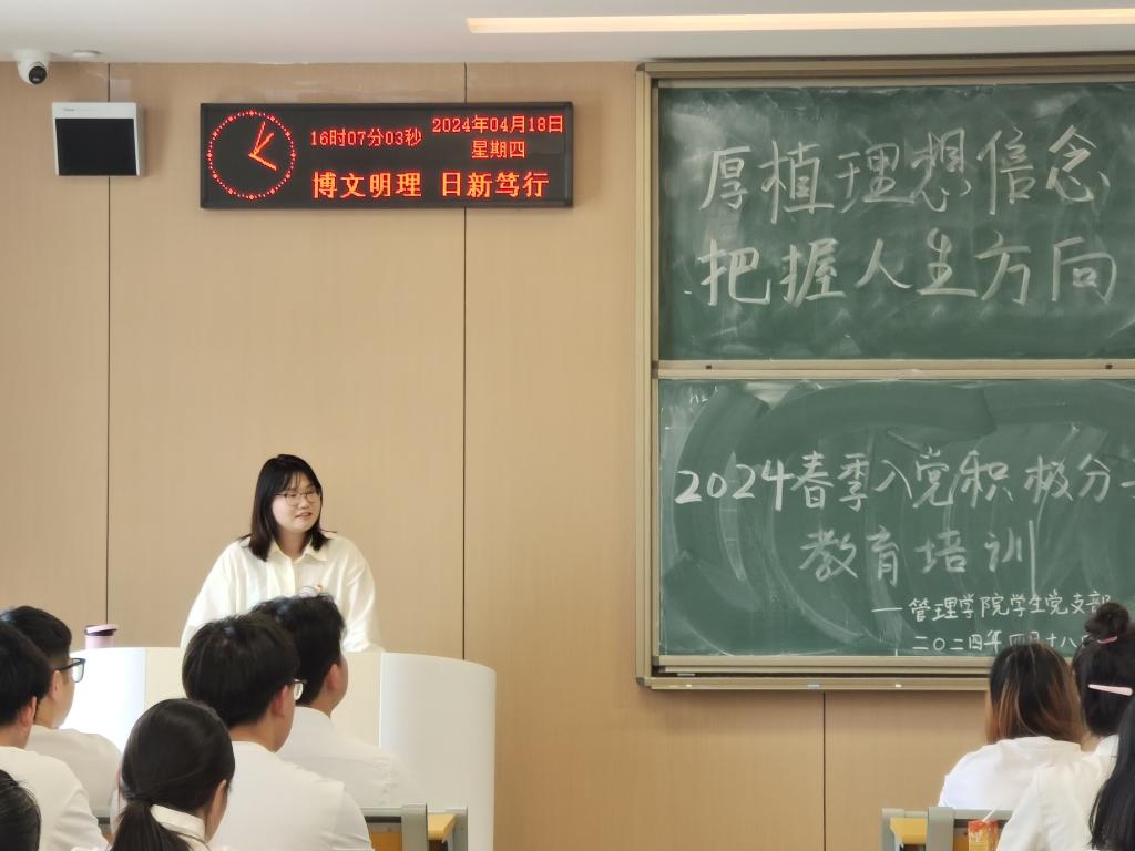 本网讯(通讯员 李宗阳)4月18日下午,A-402教室内座无虚席,气氛热烈,“厚植理想信念,把握人生方向”主题党课正如火如荼的进行。此次党课的目的是为深入学习贯彻习近平新时代中国特色社会主义思想主题教育和党的二十大精神,进一步引导入党积极分子坚定理想信念,系好思想“第一扣”。本次党课由管理学院党总支副书记杨琪主讲,管理学院学生支部党员以及22、23级入党积极分子参加。
