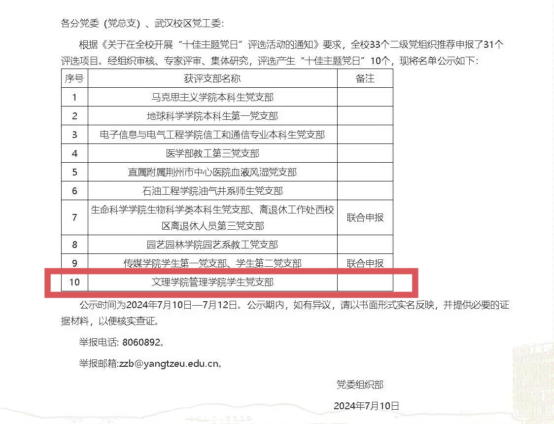 本网讯(通讯员:李琪)近日,长江大学公布“十佳主题党日”评选名单,管理学院学生党支部成功入选。