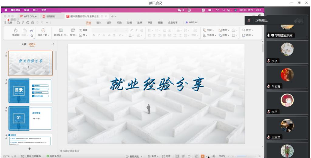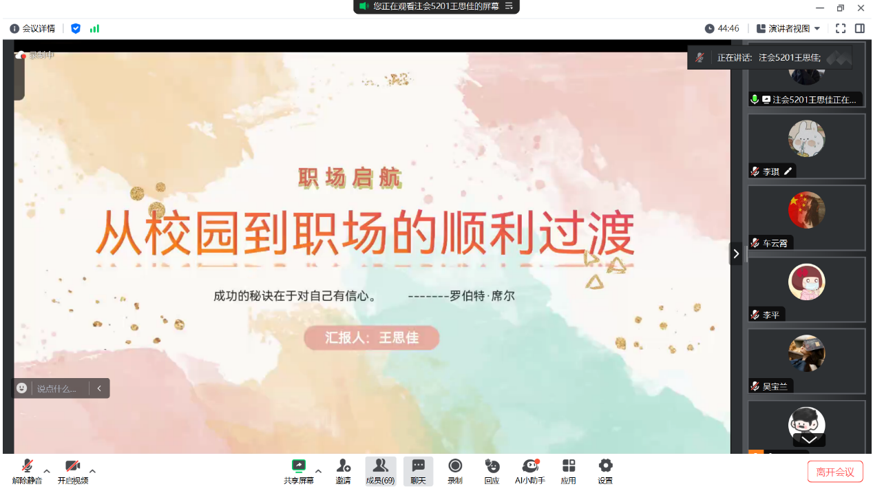 接着,罗琪学长从四个方面分享了他的求职心得。在顺利完成对学生到职场人的角色转换中,我们要对自己有一个明确的位置感和自我认知。在人际交往的领域,学长以自身的职场经验为例,给出了几点建议:我们要保持良好的形象,在日常生活中积极与同事进行交流沟通。我们要学会专注地倾听他人的观点和见解,并给予恰当的反馈与回应。当同事遇到困难时,我们应在自己的能力范围内伸出援手,共同协作,确保任务的顺利完成。学长特别提醒大家,对于未来的职业规划必须有一个清晰的认识。无论是专业知识的深入学习,还是相关资格证的获取,以及参加竞赛活动,都应与自己的职业发展规划相得益彰,形成有力的支撑。