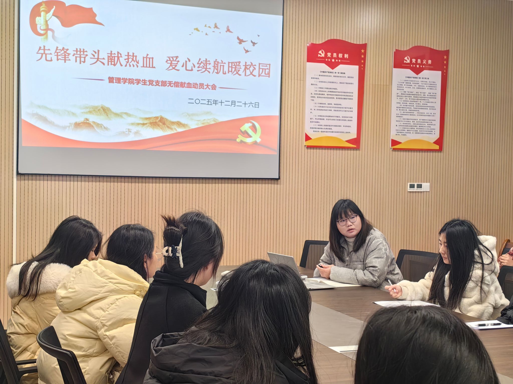 本网讯(通讯员 黄江琴)为发挥学生党员的先锋模范作用,以实际行动践行社会责任,12月26日,管理学院学生党支部组织召开“先锋带头献热血,爱心续航暖校园”献血动员大会。会议旨在通过党组织动员,鼓励学生党员带头参与献血,并积极带动广大同学投身公益,在校园内传递奉献与温暖。