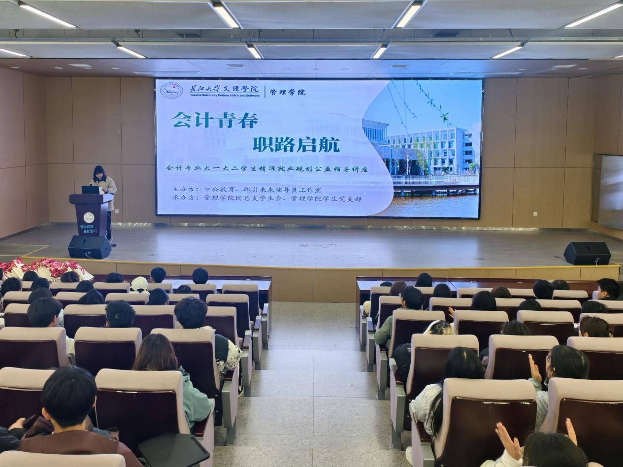 本网讯(通讯员 毛富鑫)为帮助大一、大二会计专业学生提前树立职业意识、明确发展方向,williamhill官网管理学院于 11 月 18 日 18:30 在 B-112 报告厅成功举办 “会计青春 职路启航” 精准就业规划公益指导讲座。本次活动由职引未来辅导员工作室精心策划,管理学院团学组织与学生党支部联合承办。活动由管理学院党总支副书记杨琪老师主持,辅导员李平老师到场组织,特邀中公教育胡潇老师担任主讲人。讲座聚焦低年级学生成长核心需求,充分彰显了学院在人才培养工作中的前瞻性布局与责任担当。