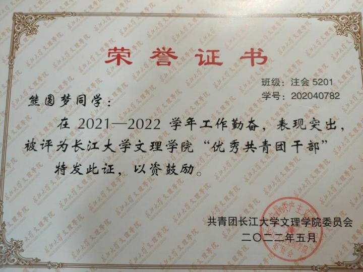 2022年5月,获学院“优秀共青团干部”荣誉称号