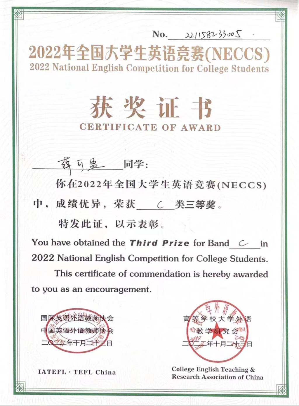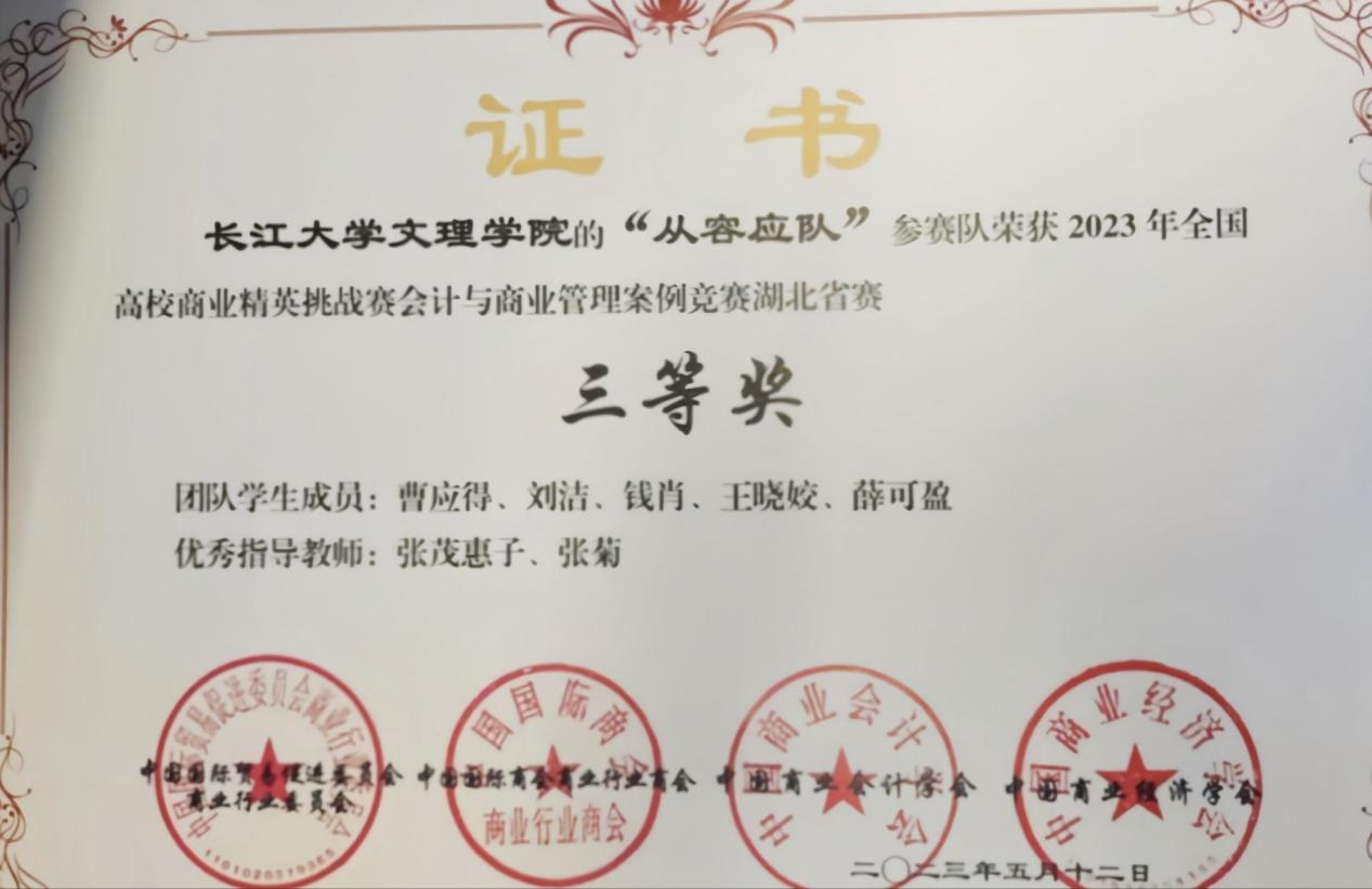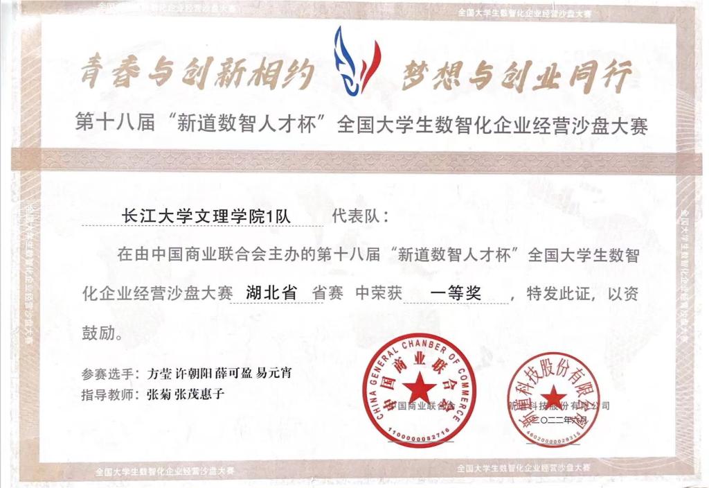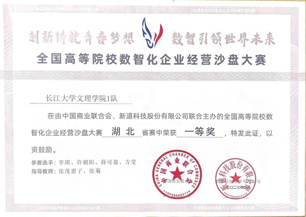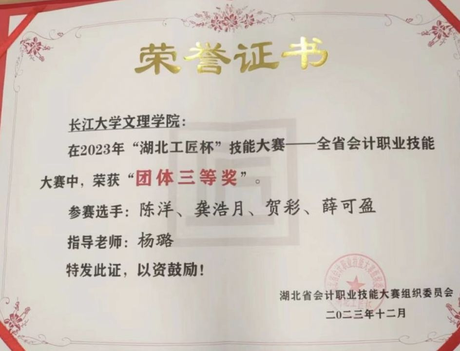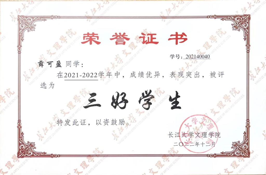 主要获奖情况:荣获学院一等奖学金等,获得三好学生,优秀共青团员、优秀共青团标兵等荣誉称号7余次。2022年4月,获“预爱予爱,你我同在”知识技能竞赛团体二等奖;2022年5月,获校级“优秀共青团员”荣誉称号;2022年6月,获第十八届“新道数智人才杯”全国大学生数智化企业经营沙盘大赛一等奖;2022年6月,通过大学英语四级证书;2022年12月,获学校一等奖学金;2022年12月,获校级“三好学生”荣誉称号;2022年12月,获全国大学生英语竞赛三等奖;2023年6月,获全国高等院校数智化企业经营沙盘大赛湖北省一等奖;2023年5月,获全国高校商业精英挑战赛会计与商业管理案例竞赛湖北省省赛三等奖;2023年12月,获全国大学生英语翻译大赛三等奖;2023年12月,获学校一等奖学金荣誉称号;2023年12月,获湖北省“工匠杯”技能大赛全省职业技能大赛团体三等奖;2024年2月,通过大学英语六级;2024年4月,获校级“优秀共青团员标兵”荣誉称号;2024年5月,获“第九届十佳大学生荣誉称号”。