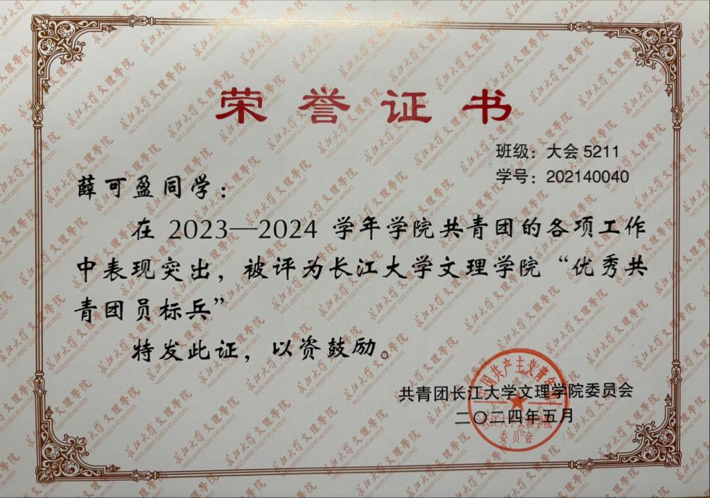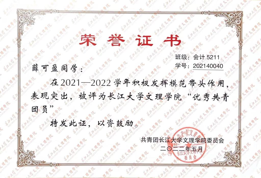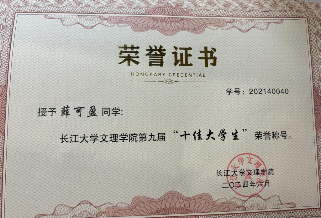 苔花如米小,亦学牡丹开。薛可盈同学表示这句话的意思是尽管吾辈大学生是平凡人,如空气中的尘埃一样渺小,如石头上的青苔一样不起眼,却可效仿苔花,虽如米小,也学牡丹开,承担起责任与担当。笃学不倦,攀登学术巅峰—方成中坚之才,自踏入文理学堂以来,她以优秀的学长学姐为榜样,从他们的身上汲取笃行的力量,经过不懈努力,连续两个学年,专业成绩与综合测评成绩均列第一,三学年平均绩点3.96,专业课98%达85分及以上,连续两年获得学院一等奖学金,被评为三好学生。除了在专业学习上的努力,英语方面的学习也一直在路上。四六级顺利过线,其中四级听力接近满分;此外,她积极参加英语类学科竞赛,均取得不错的佳绩。当然,抬头望骄阳长空,跬步行追光之路,在初级会计师考试中,双科顺利过线近20分。“人生是旷野而非轨道”,在这片创新的旷野上,除了有学识,还要潜心科研-勇闯创新前沿,在2023年12月她参加了湖北省工匠杯-会计职业技能大赛;初赛,同297家企事业单位、院校共9139名参赛者进行专业知识的角逐,成功晋级决赛,最后环节,薛可盈将所学的专业知识在财会业务技能竞赛和涉税业务技能竞赛运用至尽,荣获三等奖的好佳绩。 摸着初心与热情,她与数智化双向奔赴。其中,在第十八届“新道数智人才杯”全国大学生数智化企业沙盘大赛中,她紧跟跟随团队在省赛赛场上披襟斩击,最终成绩超越数十所高校,约100只队伍,成功晋级国赛。至此,薛可盈两次参加全国高校数值化企业沙盘大赛均获一等奖。生逢其时勇争先,踔厉奋发立潮头,2021年的夏天的开学典礼,让她便有了志向,志在入党,志在为党;在思想上,她有着明确的政治立场,遵纪守法,勇于自我反思和自我批评,为社会主义建设奉献绵薄之力。作为一名青年学子,薛可盈铭记自己的任务使命,她曾担任社团协会副会长,带领团队外出参加比赛,为校争光;同年,承蒙关照,我荣获第九届“十佳大学生”的荣誉称号。