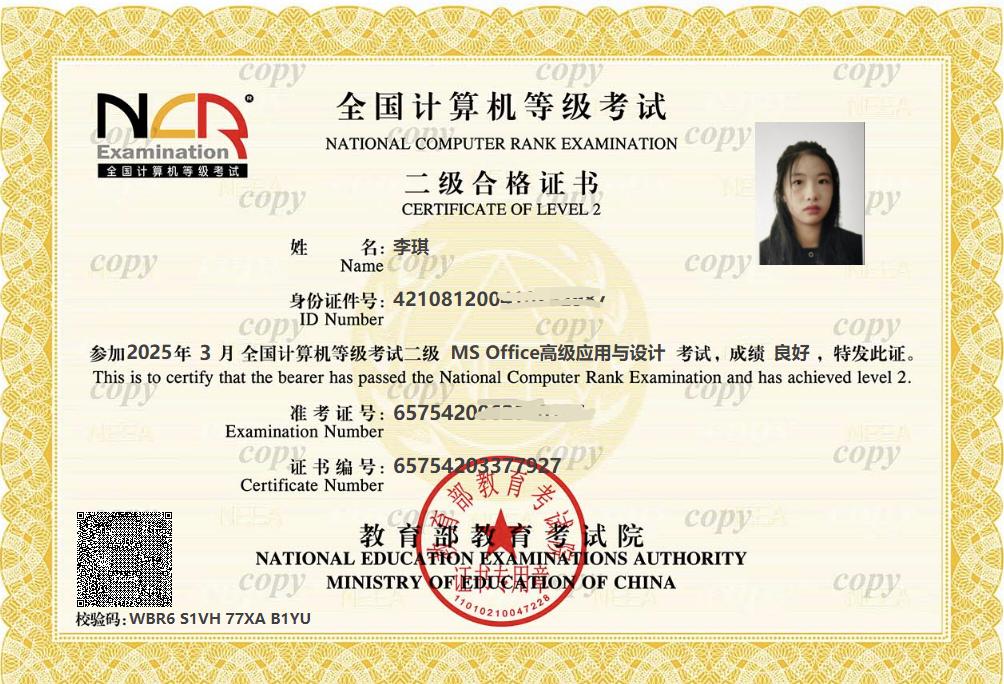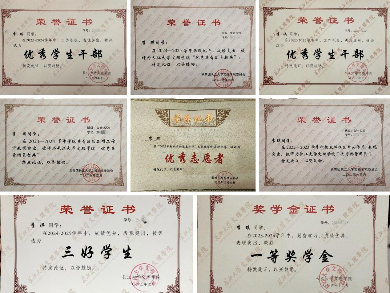 李琪连续两年获学院一等奖学金,多门课程成绩位列专业前列,43门课程85+,30门课程90+,线性代数B100分,成本会计99分,财务管理99分,获三好学生荣誉称号。她已考过计算机二级、初会、普通话二甲、英语四级。