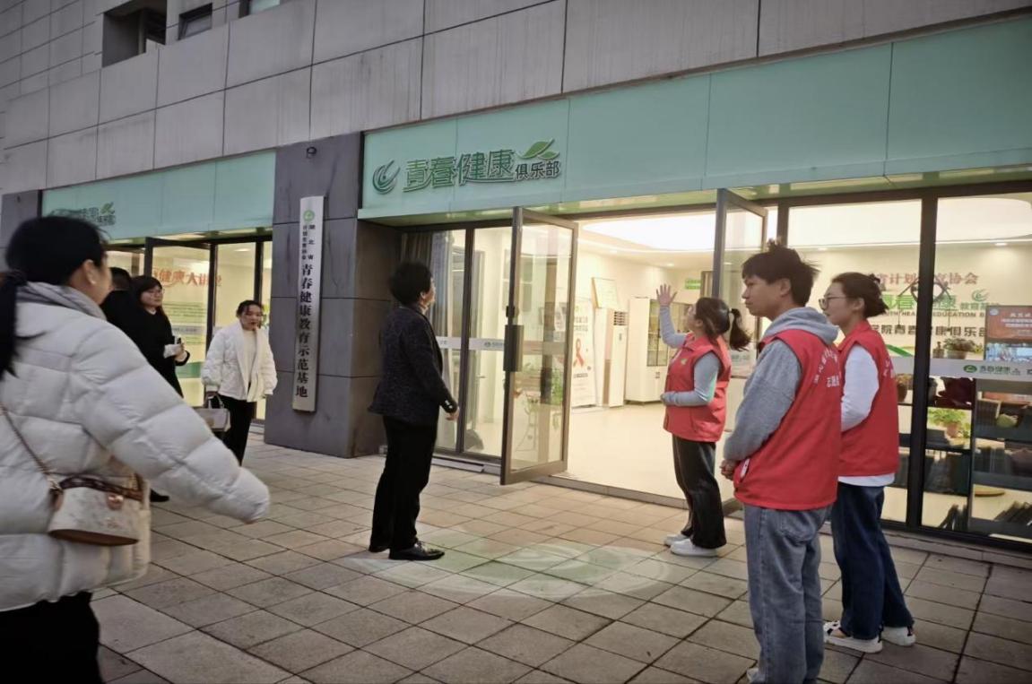 在基地讲解员的引导下,领导首先参观了功能分区明确的280平方米实体空间,我社成员向领导介绍了该基地作为“省级青春健康教育示范基地”与“国家级青春健康俱乐部”的硬件设施、所获荣誉,以及社团纳新、“防艾健康走”等品牌活动与防艾主题短视频获奖成果。