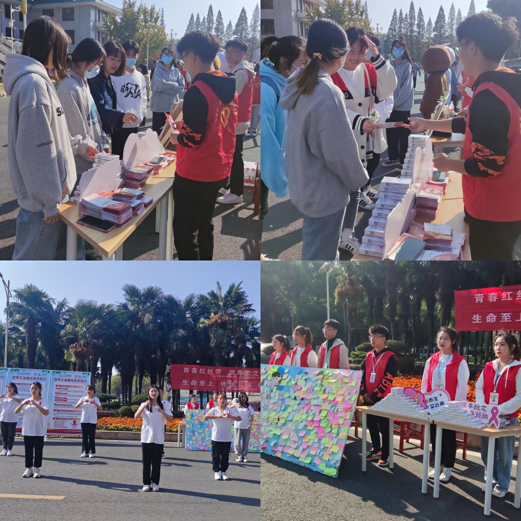校园内,志愿者们通过发放宣传册、免费避孕套、写寄语、知识问答、朋友圈合影等方式开展宣传活动,青春健康同伴社社员现场跳起《生命之舞》,号召大家珍爱生命,预防艾滋。同时在校园各个角落,志愿者们戴好红丝带,拍摄防艾宣传视频,拍摄的防艾视频用于校园内外防艾宣传倡导。