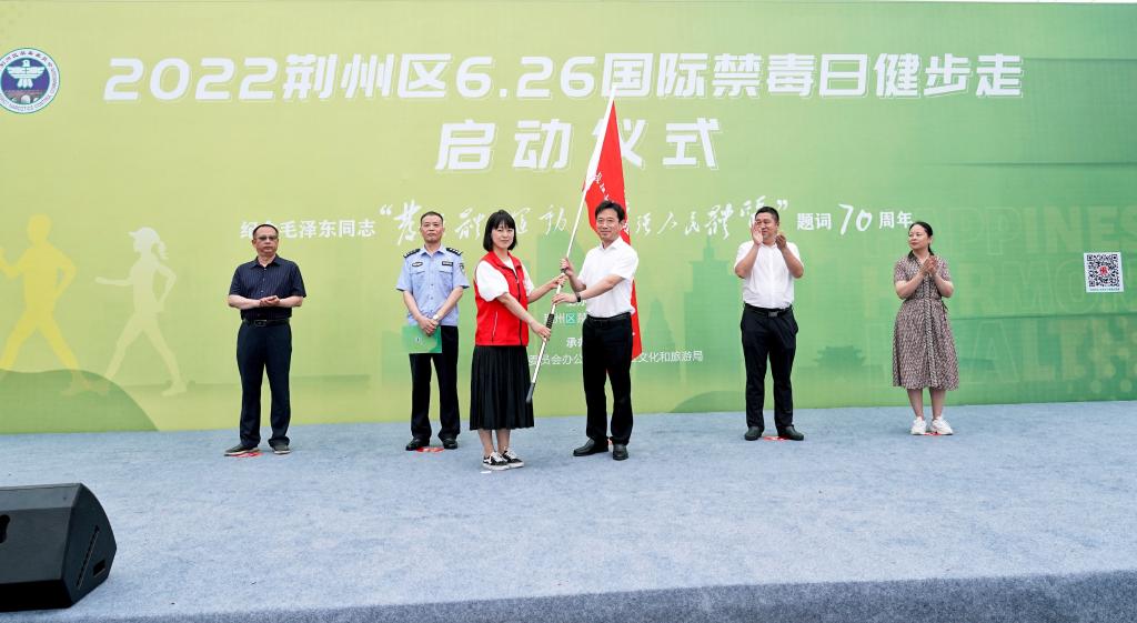 麒麟步、断毒路、齐出手、毒败走。禁毒宣传不仅要在理论中,要营造无毒健康氛围,宣传工作也要从运动中开展。6月24日上午,在“全民禁毒,健康生活”2022年荆州区“6.26”国际禁毒日健步走活动中,荆州区委常委、常务副区长周远栋向williamhill官网志愿者服务队授旗。