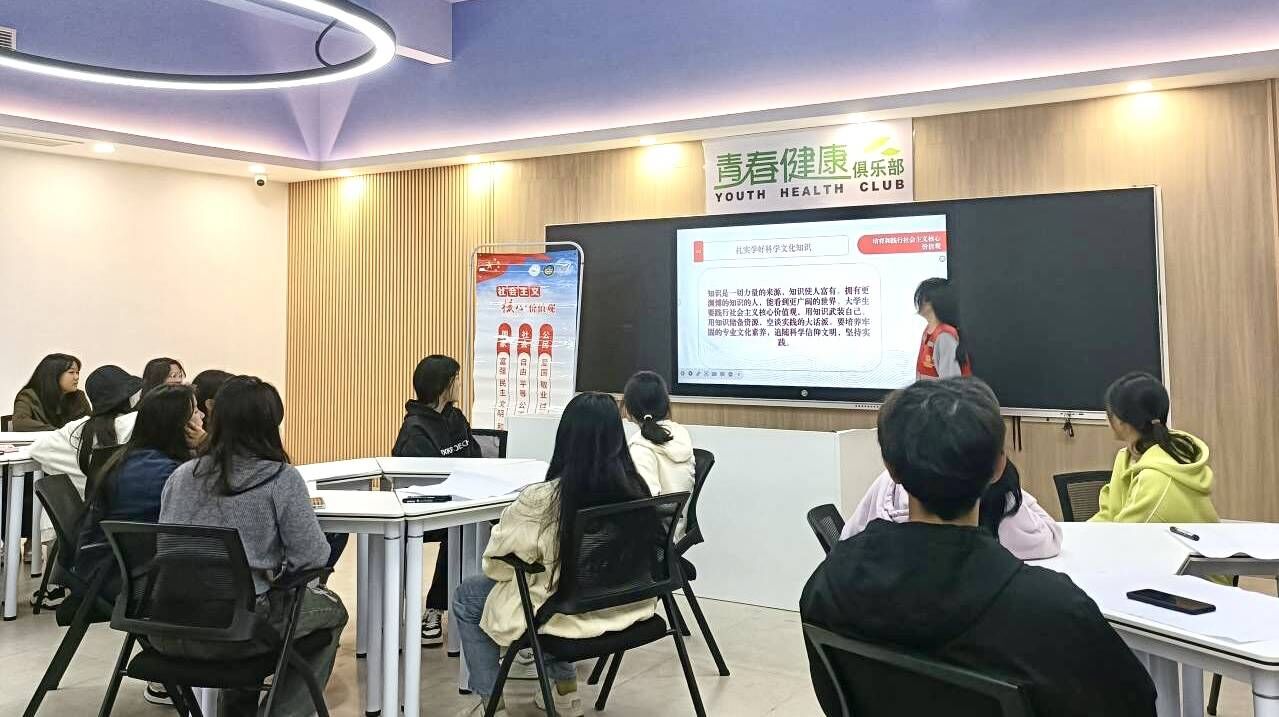 活动由青春健康同伴社主持人李璐展开,在活跃轻松的氛围下,宣讲活动顺利开展。开篇主持人通过破冰游戏——武松打虎,主持人念一段文字,过程中凡是听到“虎”字就要站起或坐下,考察了大家的反应能力,活跃现场氛围,为接下来活动的进行打好基础。后面又通过二十大小知识问答引导大家深刻理解二十大精神,回忆新时代下的伟大成就。过程中主持人对同学们进行了正确观念的引导,为大家介绍了社会主义核心价值观的发展与意义,提出了自己的建议和看法,同学们首先要学好知识,练好本领,提升理论素养,增强自身的责任担当和综合素质。同时,要关心身边的同学,共同进步,真正做到文明和谐。激励同学们积极发言,表达各自对和谐与文明丰富内涵的深刻理解。整个过程体现着对正确价值观的思考与探索,在短暂的课堂之中,树起了人生的导航帆。