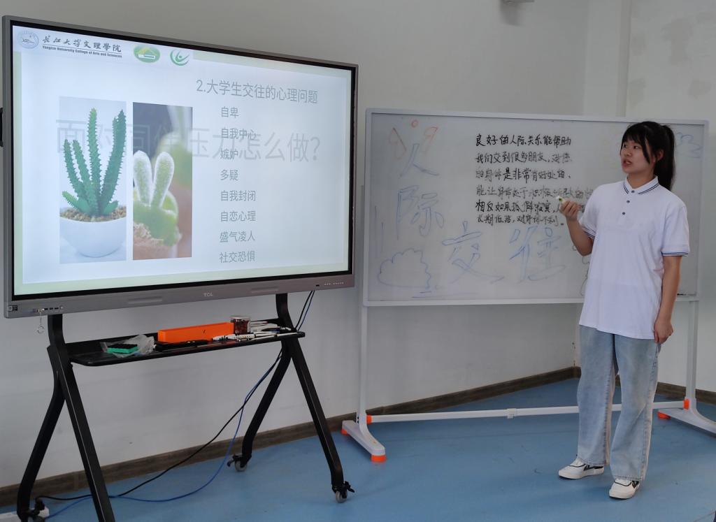在活动开始前,主讲人石佳先让同学们玩了一个破冰游戏——大风吹。在游戏过后就开始进入本次活动的正题,石佳同学从不同的方面讲解了大学生人际交往的类型以及大学生交往的心理问题等内容。互动环节中主讲人设置的情景卡片,让同学们根据不同的情景想出不同的解决问题。第三组同学展示的是解决人际交往中不合群的问题,她们的代表发言人说到:“每个人都是独特的我们不必为了他人而改变自己,正是因为每个人的独特性才构成了这缤纷多彩的世界。”最后石佳同学也总结到:“人要生活就离不开社交,所以人际交往技能是我们每个人所必备的技能,希望大家能通过这个讲座能学会一些知识,运用到自己的日常生活中。