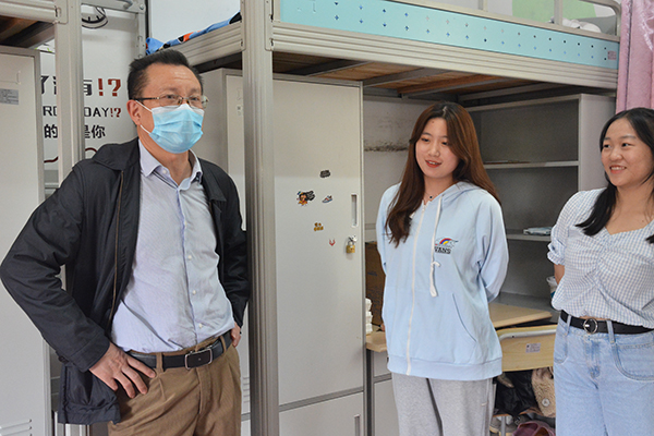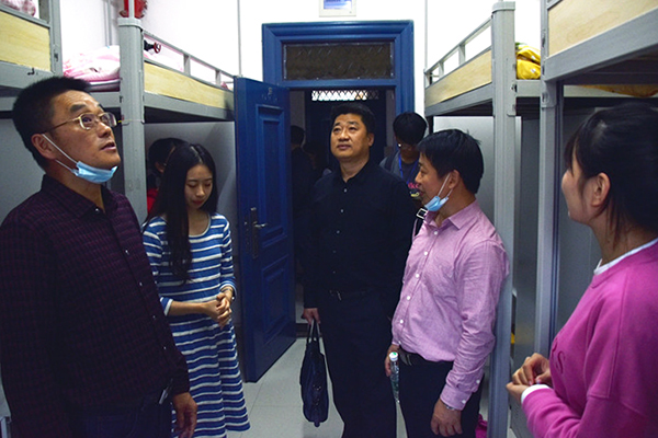 下午4时,迎新工作接近尾声,院长王文凯,党委书记朱继平,副院长尹家经、康建虎,党委副书记孙细望率相关职能部门及高职部主要负责人,分别来到西校区专科新生寝室看望新同学。