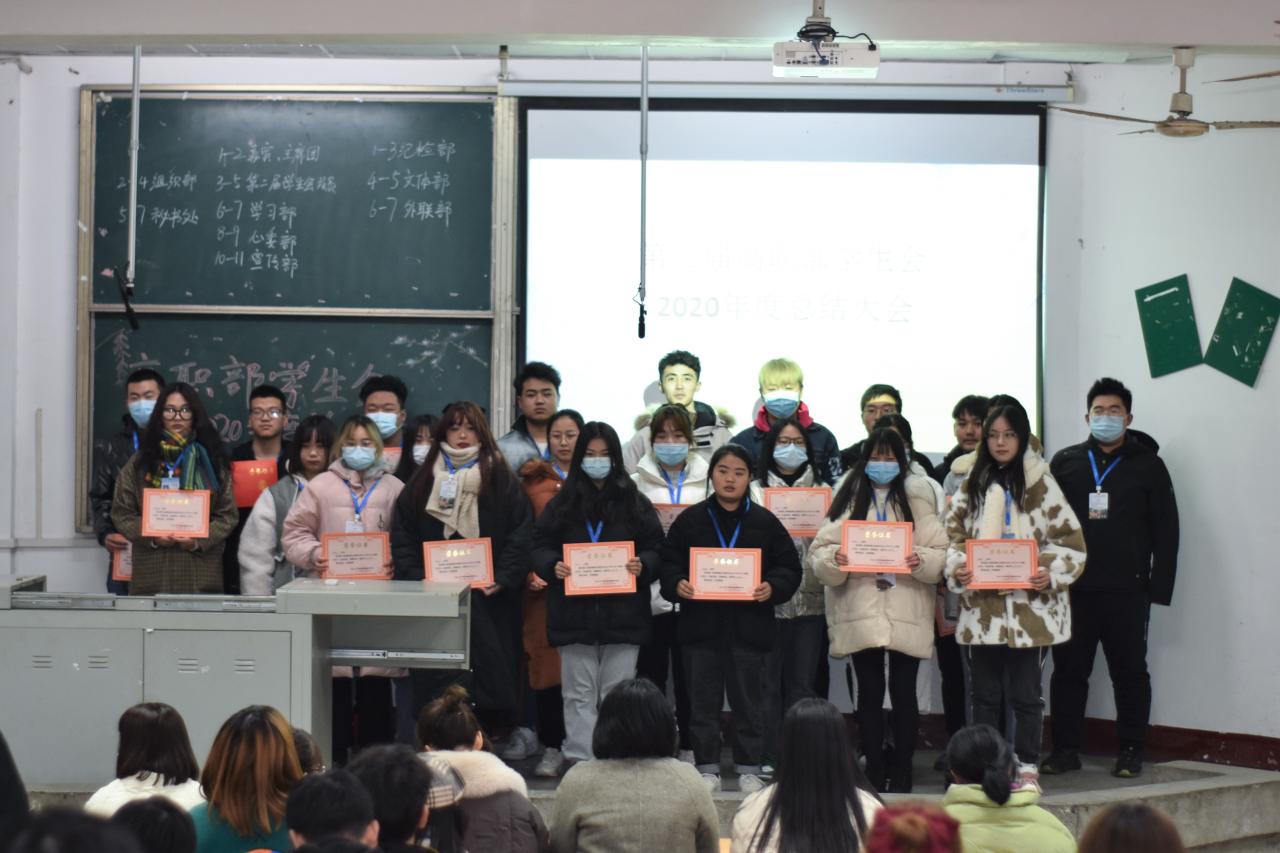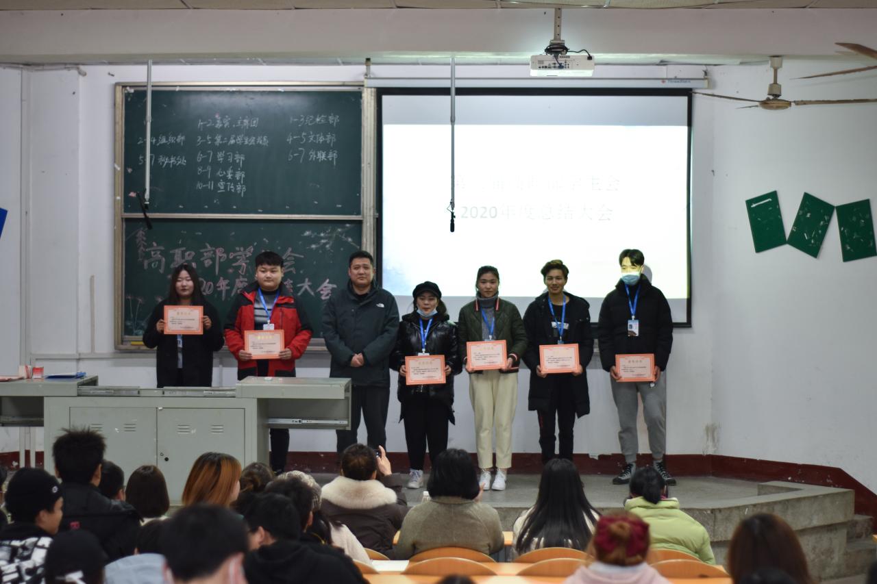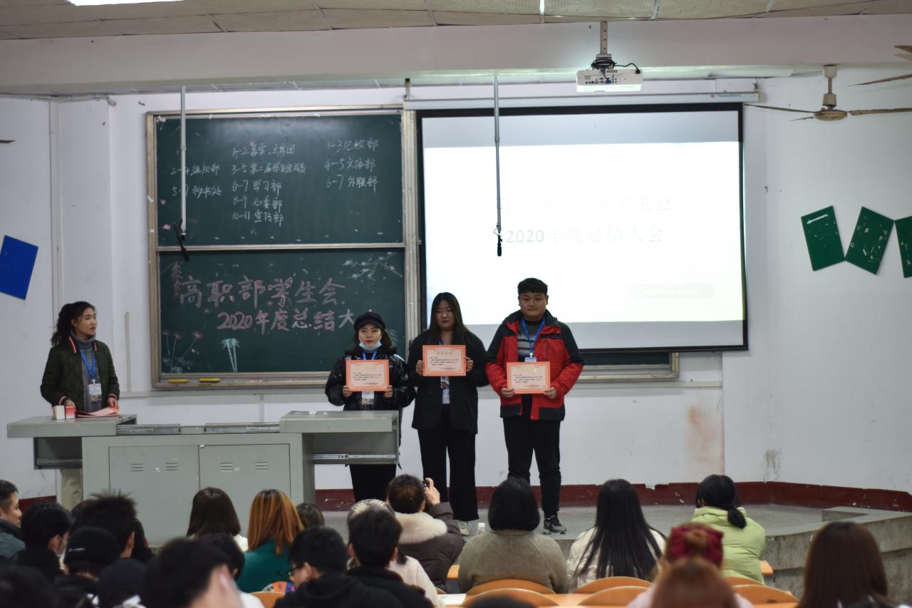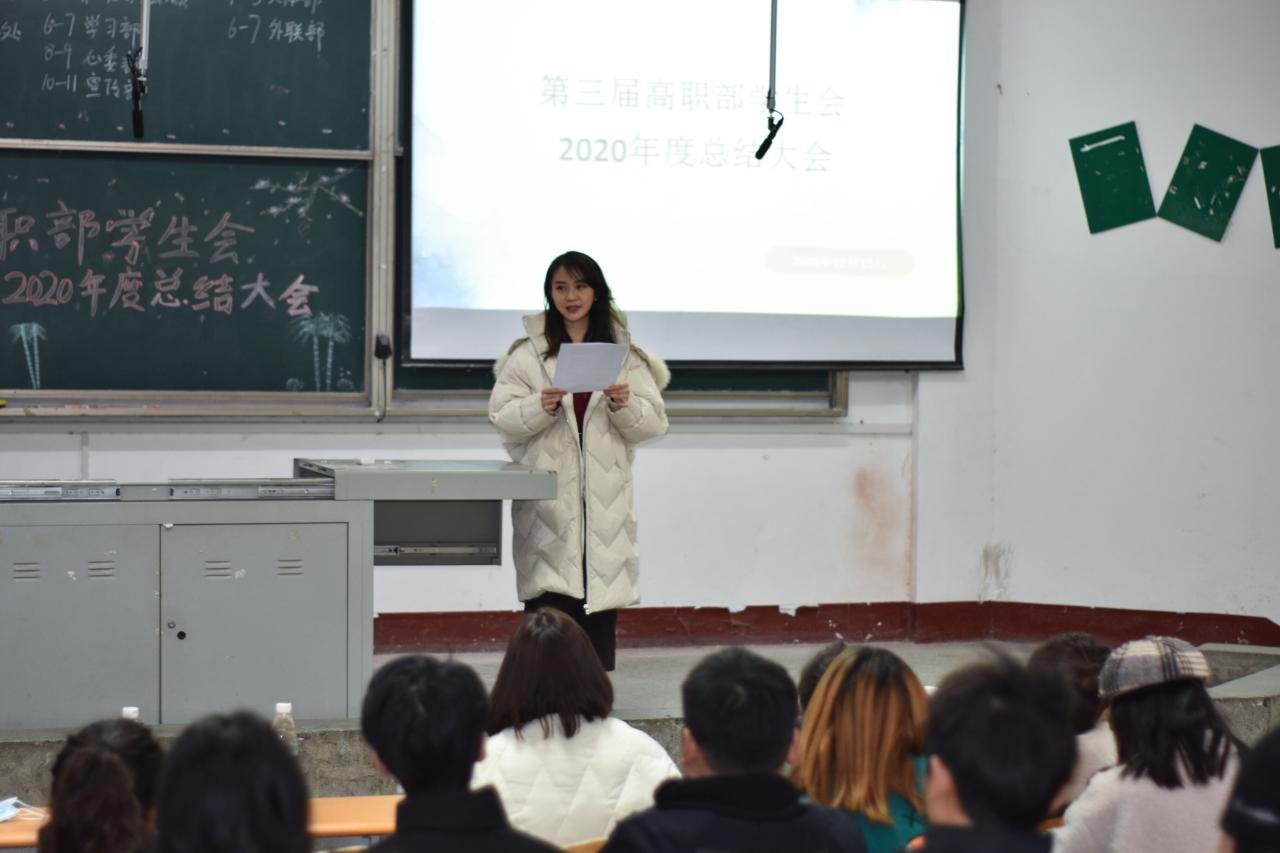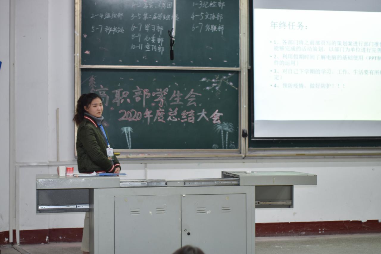 2020年度学生会工作即将结束,为推动高职部学生会工作更好更强更长久的发展,保证学生会新旧成员交接后能够更快的正常运转,同时对上一年度在工作中表现突出的学生会干事给予表彰,高职部学生会在西校区四教200召开了2020年度总结大会。此次大会共七项:第一项、由主持人介绍出席本次会议的嘉宾;第二项、高职部学生党支部书记黄婷婷老师上台讲话;第三项、颁发证书;第四项、各部门依次上台作工作汇报;第五项、第三届高职部学生会主席团成员代表周海静上台发言;第六项、高职部学生会指导老师王瑆皓老师上台发言;第七项、主持人宣布会议结束。